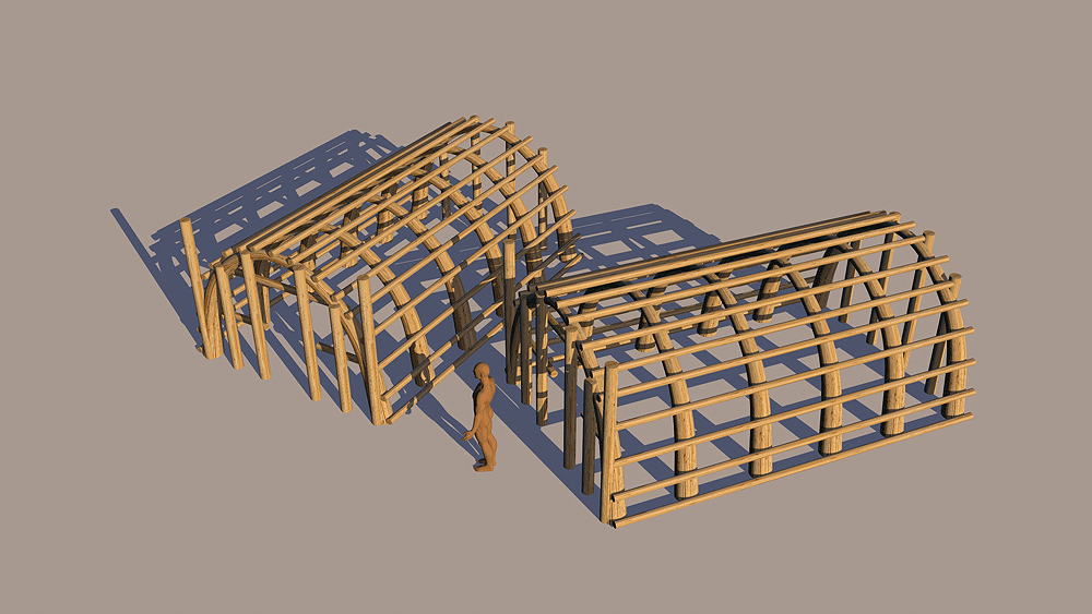 Construction materials: bundled and woven and tied reeds forming arches and cross purlins; woven reed mats form the building envelope, some which ar woven with perforations to allow light and ventillation. Front and back vertical columns are also bundled reed mats.