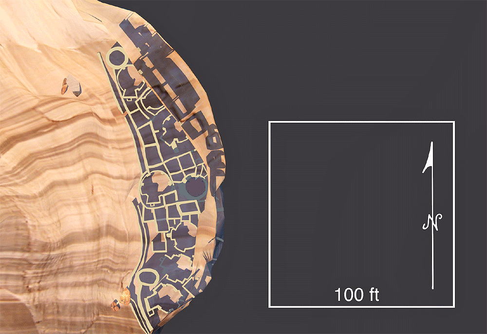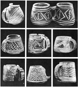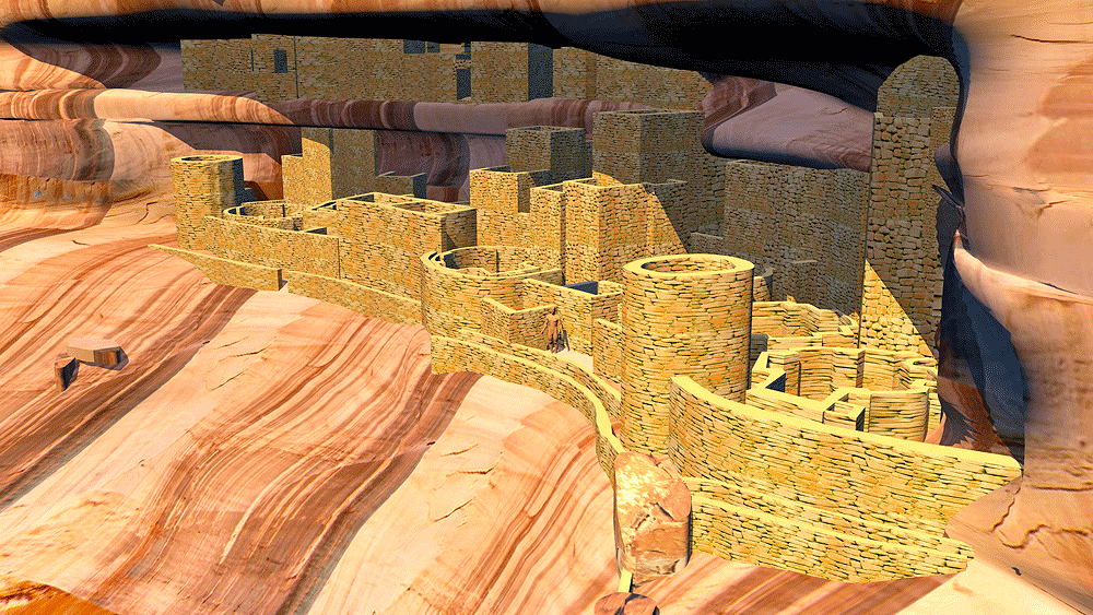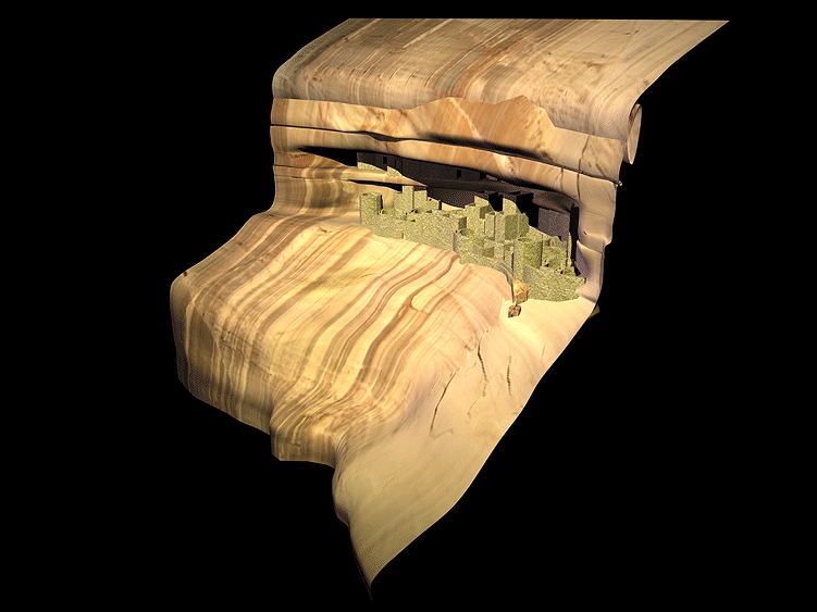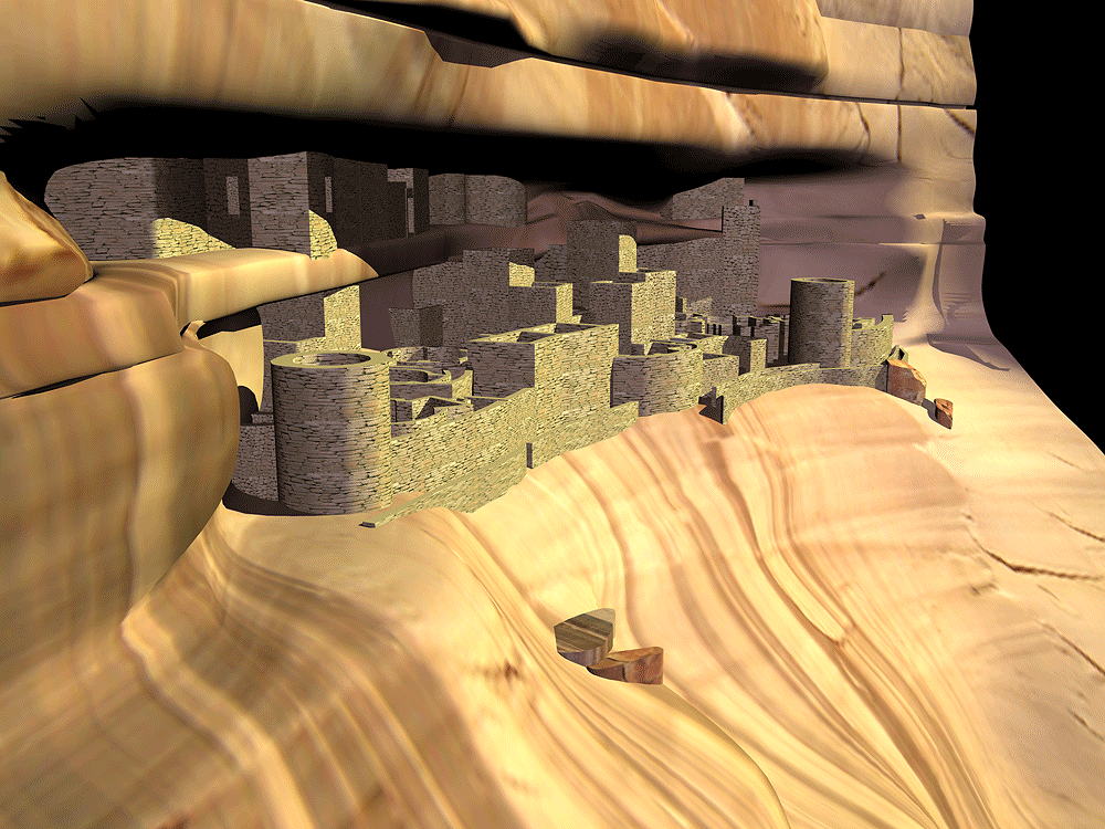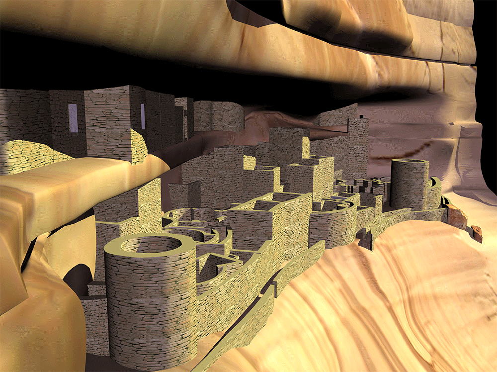 McElmo-Mesa Verde Black-on-white mugs found during excavation at Mug House ruins. Photos: National Park Service San Juan Ancestral Puebloan Culture, occupied from 1100 C.E. to 1300 C.E.,; located in Mesa Verde National Park, Colorado. Elevation is c. 2039 meters (6690 feet) above sea level. Materials: mortarless stone walls, adobe walls, wood log roof structure, with mud/clay roof. Data for CG model: |
