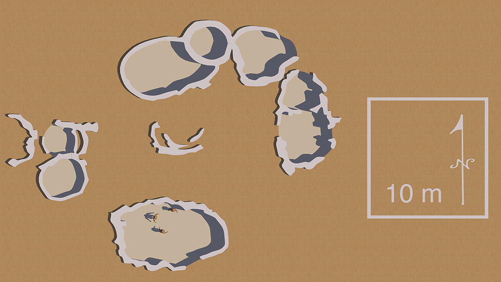 Netiv Hagdud Pit Houses This site, located in the Jordan Valley, West Bank of present-day Israel, is one of the earliest farming comminities in Southwest Asia (8300 -7400 BCE), was based upon subsistence combining cultivation of wild barley, gathering of wild fruts and nuts, trapping of wildfowl, continued hunting of gazelle and other wild mammals. Ovoid and circular pithouse were the earliest form of houses. Remains of plants and wild fowl indicate that the site was occupied for most of the year, from September through early June. The construction process involved digging the pit, placing limetone foundation and small post braces at frequent intervals against the side of the pit, and then infilling the spaces between the posts with mud and stones. Elevation is c. 200 m. (656 ft.) below sea level. Construction: mud brick on stone foundations with clay and it is speculated that clay and reed roofing was placed over wooden support structure. Walls and floors were plastered. Source of data for CG model: |