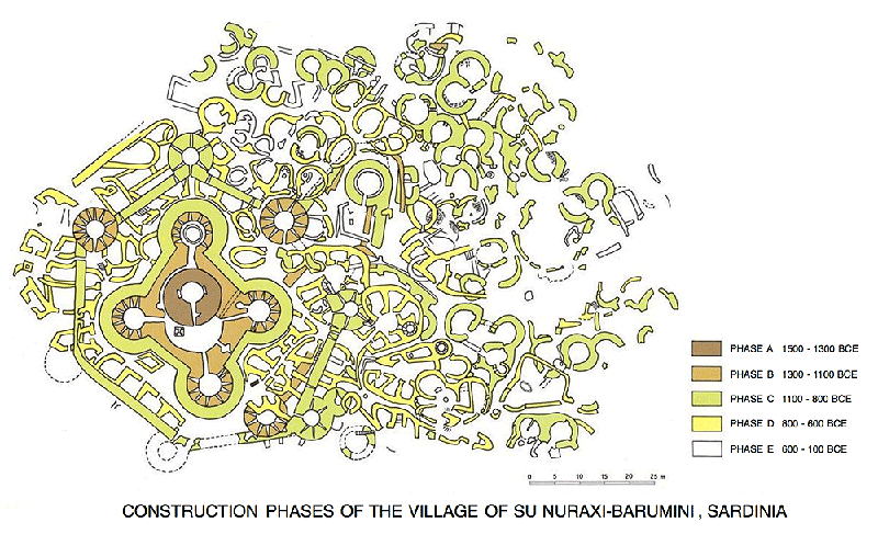 Sardinian prehistoric civilization, main type of megalithic edifce developed during the Nuragic Age between 1900 B.C.E. and 730 B.C.E. Sardinia, an island in the Mediterranean Sea, west of Italy, contains many ruins of these villages of round thatch roof houses clustering around a walled tower. The Nuragic village illustrated here is located in Barumini, Sardinia.