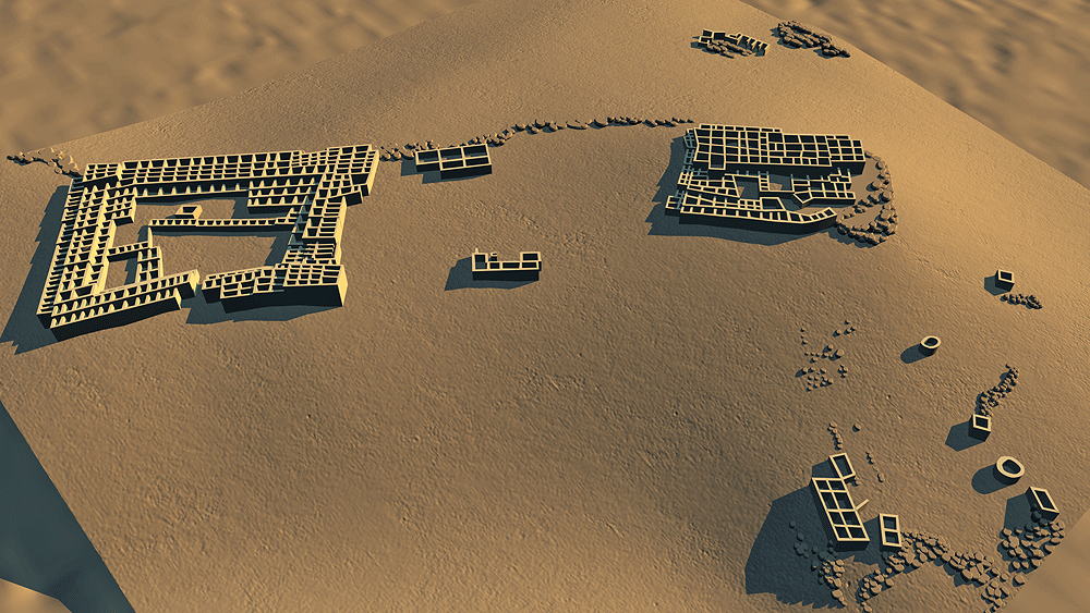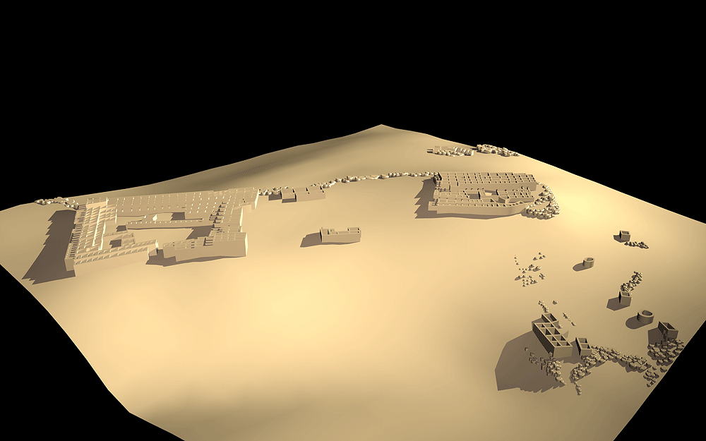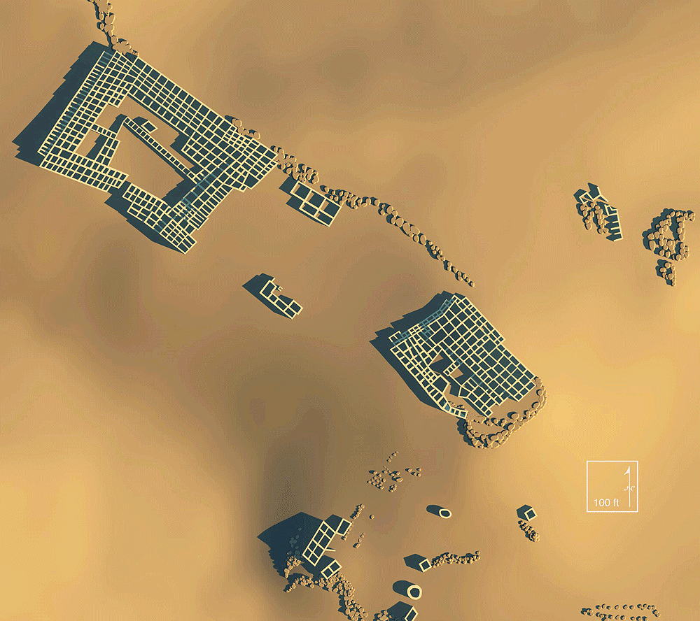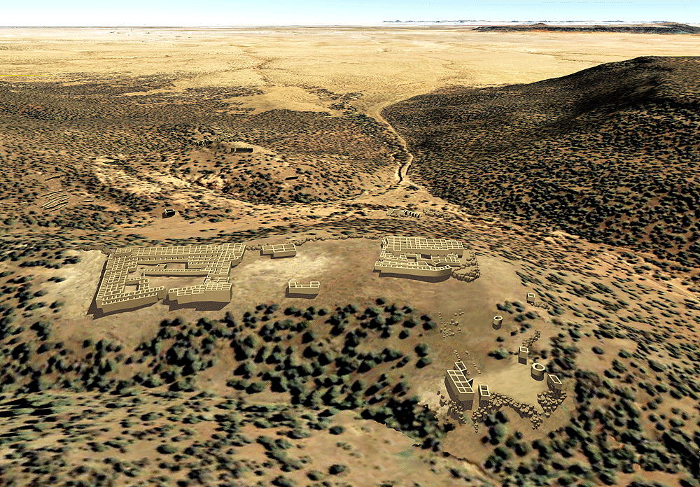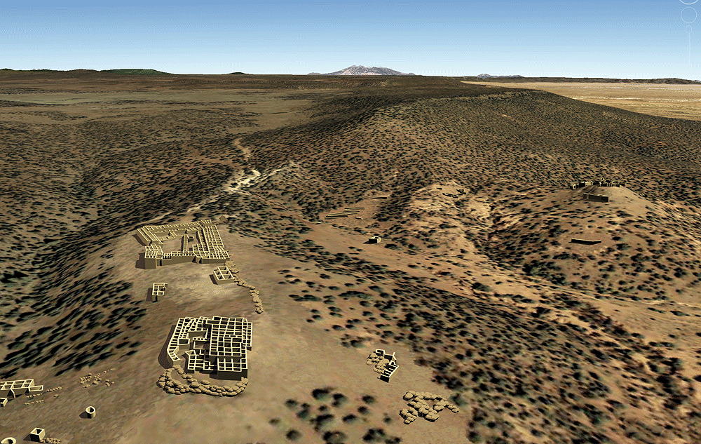 Nuvakwewtaqa (Hopi for "Snow Belt", formerlay known as "Chavez Pass") Sinaqua Culture, constructed and occupied between 1050 C.E. and 1425 C.E..; located on the Coconino National Forest in Chavez Pass, Arizona, about 15 miles southwest of the Meteor Crater, in a natural gap through a rocky escarpment separating the arid, lower altitude Little Colorado River Basin from the cooler, moister Anderson Mesa and Mogollon Rim areas. The Chavez Pass area is known to the Hopi as Nuvawewtaqa, or "Snow Belt". The Zuni refer to the area as Kumanch an A'l Akkwe'a and the Navajo call it Jettipehika. These cultures all have stories transmitted through generations about the landscape and earlier residents. The only perennial waterway in the area is the Little Colorado River about 30 miles to the northeast. The original inhabitants of Nuvawewtaqa relied upon a spring in Chavez Pass for drinking water. Master farmers used a dry-adapted variety of corn and other plants utilizing their extensive knowledge of the land and what would flourish in that environment, utilizing techniques of rain water runoff capture management. Elevation is 2120 meters (6600 feet) above sea level. Materials: main floor walls: basalt stone; upper walls: tabular sandstone or limestone, mortar used on tallest walls, up to three stories; wood log roof structure, with mud/clay roof. Data for CG model: |