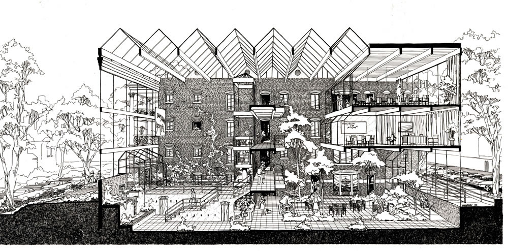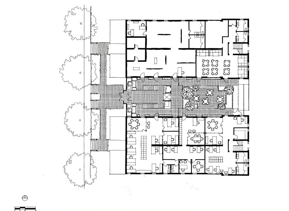 The developer's intent was to add a passive solar link between these two typical central Denver apartment buildings, and convert them to office space. A glazed roof over the new central atrium allows the south-facing masonry wall of the north building to act as a thermal storage wall.