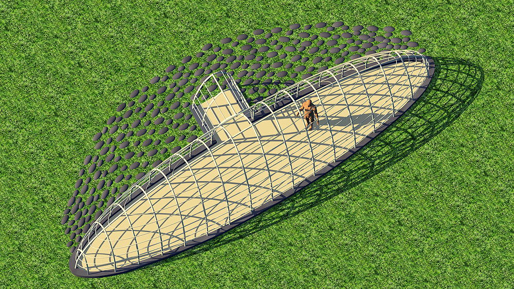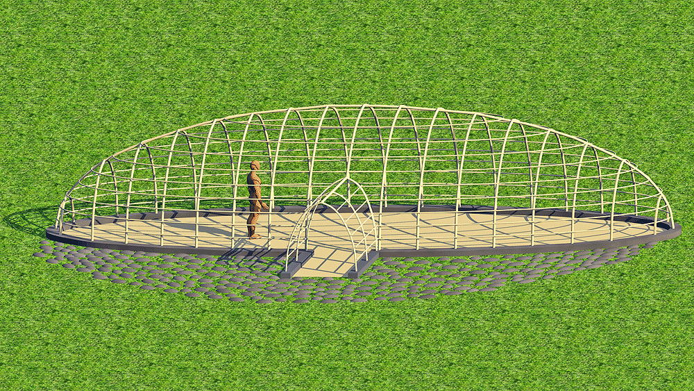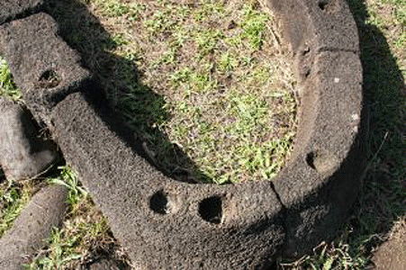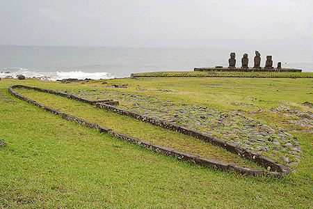 Easter Island Polynesian culture, c.1000 C.E. to 19th Centruy C.E., located near Ahu Tahai, Moai statues. Elevation is c. 8 meters (25 feet) above sea level. Materials: stone footing and front apron, wood structure, thatch roof. Data for CG model: |