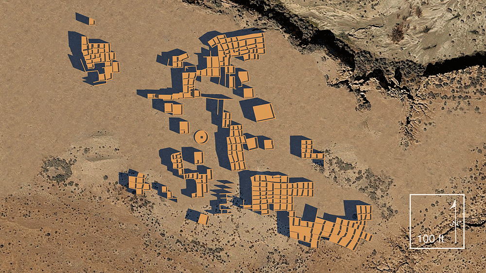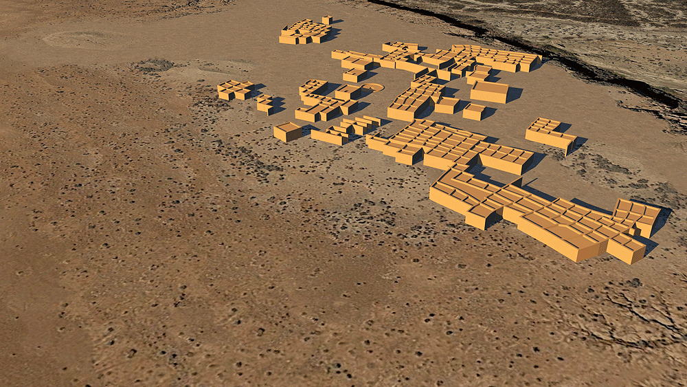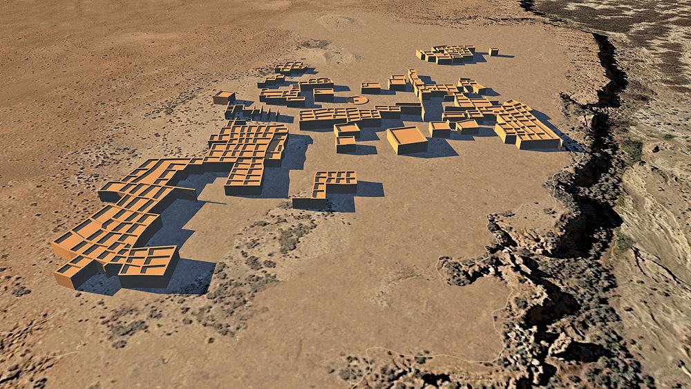 Chaco Culture, Chaco Culture Influenced, New Mexico, Constructed 1350 C.E. - 1500 C.E.; located on Isltetta Pueblo, New Mexico, 19 kilometers (12 miles) southwest of Los Lunas, New Mexico, on the west embankment of the Rio Puerco. Elevation is 1526 meters (5006 feet) above sea level. Materials: adobe walls, wood log roof structure, with mud/clay roof. Data for CG model: |