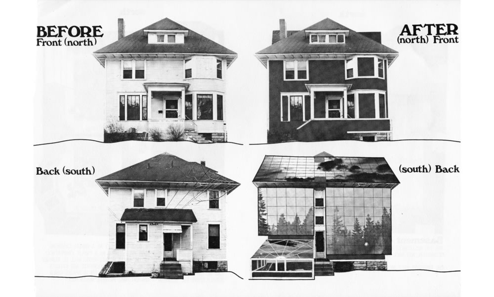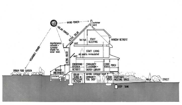 Photomontage showing active solar water heating array on south roof and veritcal wall, and a solarium with a spiderweb motif.