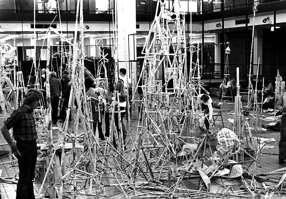 Dennis Holloway, with an appointment from the School's Head, Professor Ralph Rapson, began to direct/facilitate the three-quarter pre-architecture freshman lecture course, "Environmental Design"--an introduction to the professional design programs of the School. Holloway, sensing the need to get students into the real world and away from the "lecture hall effect", devised "Project Ouroboros" as a pedagogical process of hands-on materiality to open the individual and collective cognitive, physical, creative, and spiritual faculties of the class of 100+ students. The focus of the first quarter included lectures (some from diverse professional disciplines), readings, diaries, multi-media experiences, field trips, and rapid sketch-design projects. In the above photo, students work in the School's Courtyard on a surprise design project, competing to build the tallest "tower" using only a newspaper and drafting tape -- a test of intuitive structural design skills.