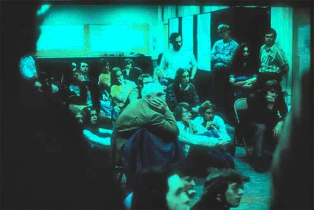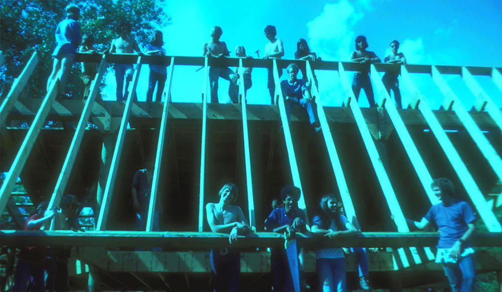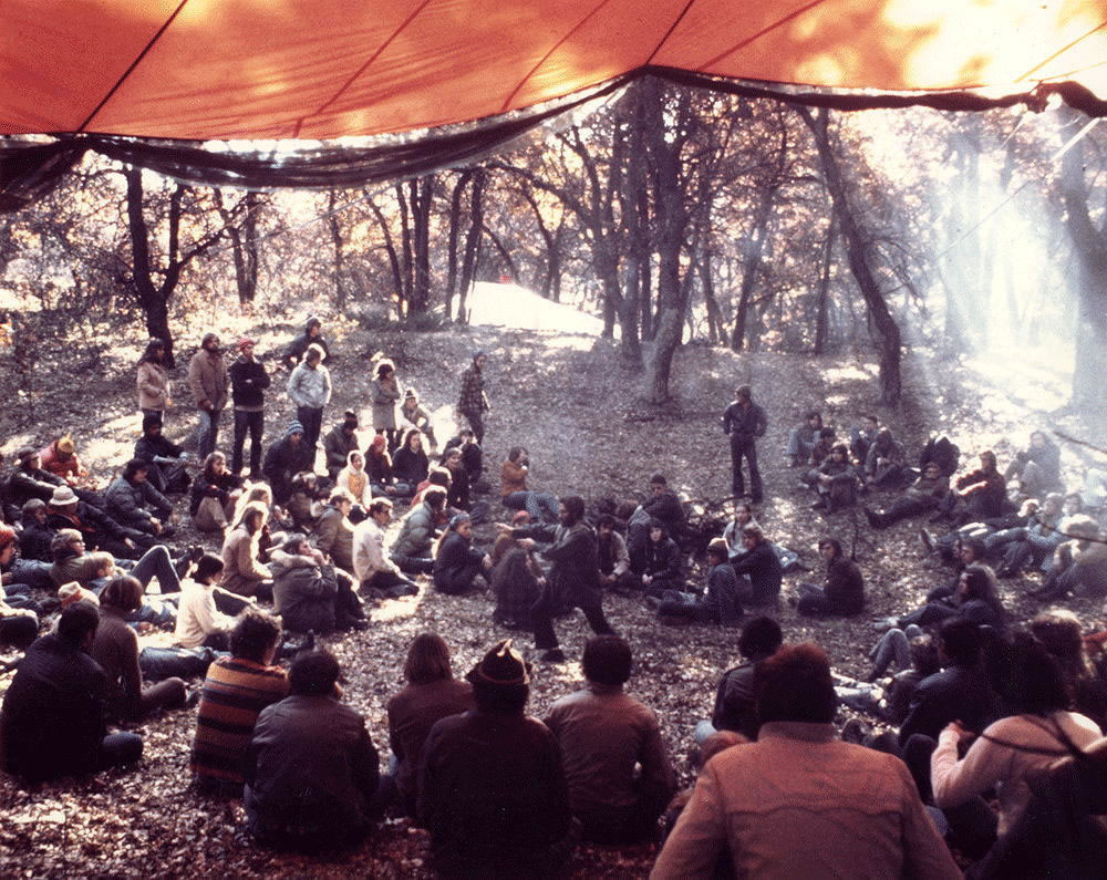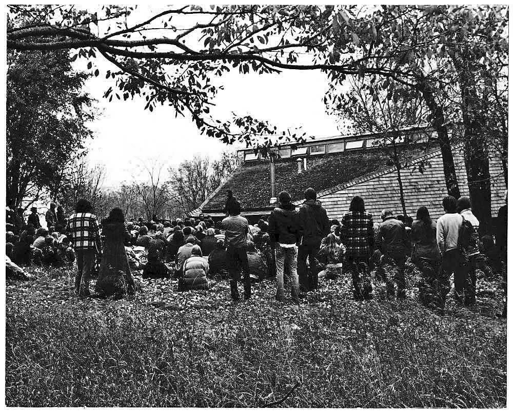 In subsequent years between 1974 and 1976, new teams of Freshman Environmental Design students continued the development of the Ouroboros South house. The photo shows Professor Holloway introducing the 1975 students to that year's goals at the house site.