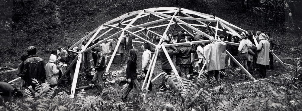The entire class constructed an R. Buckminster Fuller "geodesic dome" using pre-cut 2x4s and steel hubs and straps, to be used as a shelter later in the evening for the group campfires and discussions. The class of students began to experience a sense of unity,
