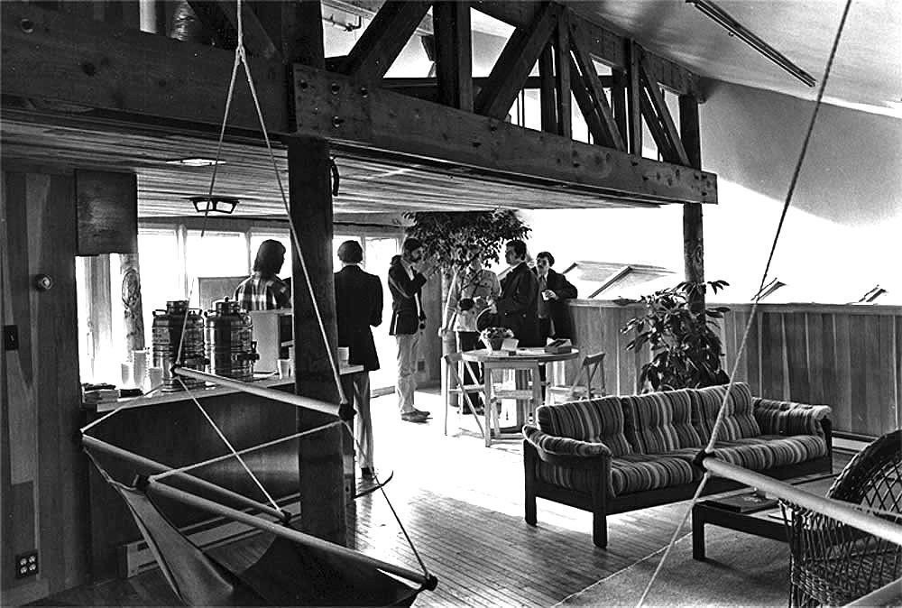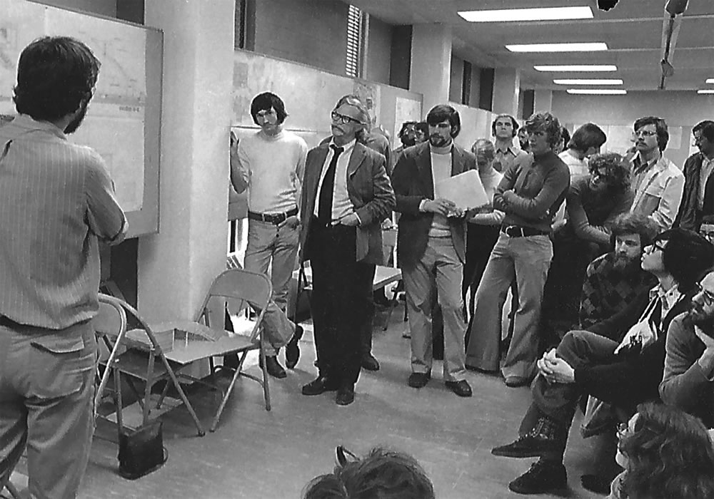 During the second academic quarter, the First Arab Oil Emgargo occured. Holloway, sensing a new urgency for architecture and environmental design to be more energy and resource conserving, issued the design problem completion class: design a small residence that would be "off-grid" and autonomous to the greatest extent possible, including greenhouse food production. Collaborative design teams were formed and each team was to produce a design proposal including a three-dimensional model, and construction drawings. Holloway intentionally pushed this challenging envelope for the novice students many of whom had no previous design experience. The research phase of the teams' efforts was augmented by guest lectures from diverse academic disciplines, to broadent the context of the project, which Holloway announced would be calle "Project Ouroboros" - a symbol of recycling energy and resources in a finite world. Above, University Regent and agricultural conservation pioneer, George Rauenhorst, discusses the Project with the entire class, as each team presents its design proposal.