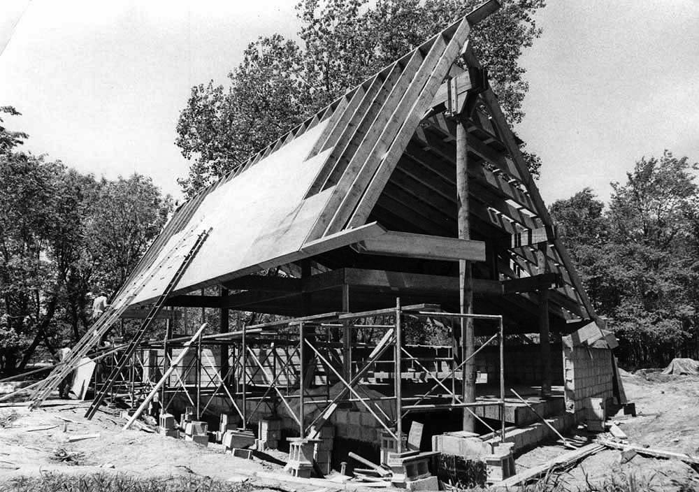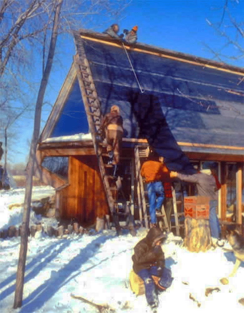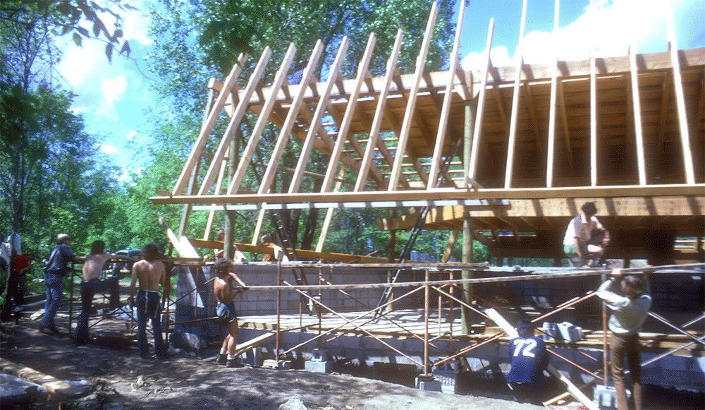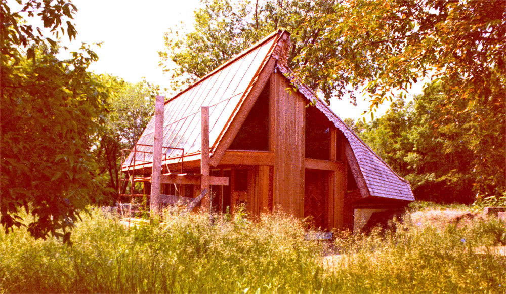 Above, the south-facing roof under construction for the active solar collector array. A "trickle-down" active solar collector system, invented by Harry Thomason was planned at first, but after testing, was removed and replaced by a second system designed by Mechanical Engineering Masters student, John Ilse.