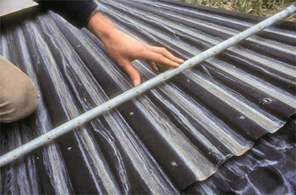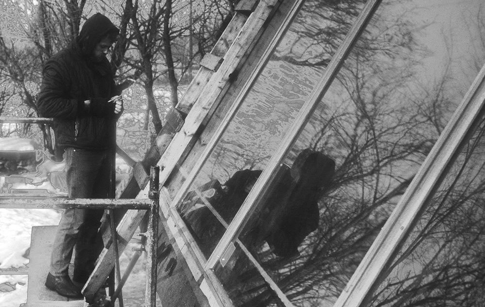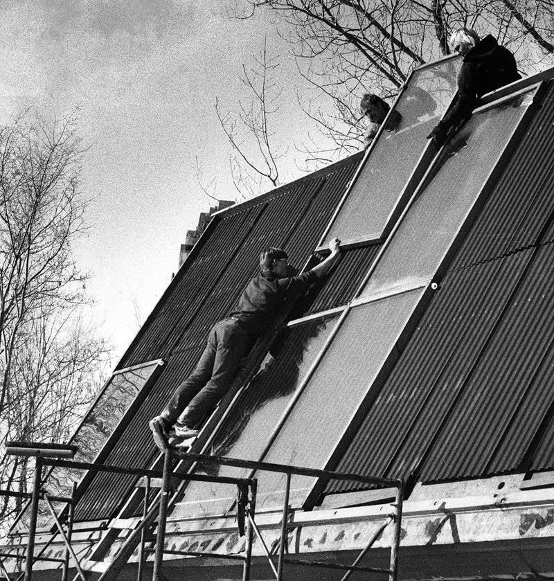 The Harry Thomason solar collector system was composed of corrrugated galvanized steel sheets, painted flat black under glass. A perforated water supply pipe at the top of the array, allowed water to trickle down over the metal sheets absorbing the heat gained from the sunlight, and draining the water into a basement tank. The tank of heated water was surrounded by fist-sized rocks, and air was forces over the rocks to heat the house air space. After a season of operation, it became apparent that the hard water was depositing calcium onto the corrugated metal, resulting in a white color deposit that reflected the sun's heat and greatly reduced the efficiency of the system. Clearly the system was not workable and a new system would have to be developed. Faculty and grad students from the University Institute of Technology came to the rescue, and an intensive collaboration to solve this problem began. The ME grad student, John Ilse, proposed a closed steel pillow absorber with de-ionized water circulated inside. The following photos show Ilse and the Environmental Design students installing the Ilse system.