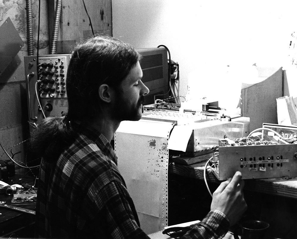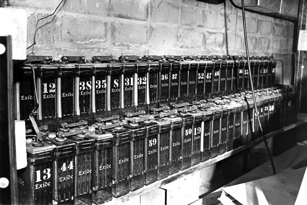 Alan Sondak set up this array of bateries in an early experiment to store the energy generated by his wind generator.