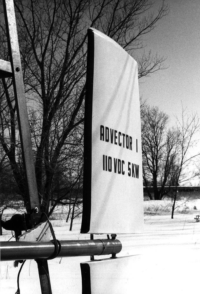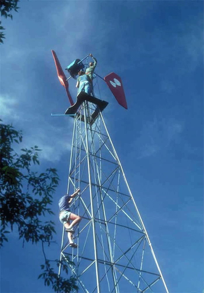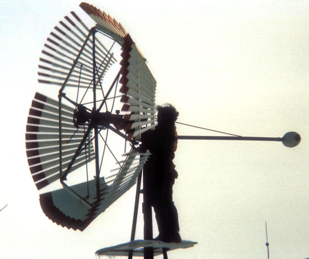 Wind power for pumping water and for electric generation became widely used in Minnesota with the Rural Electrification in the 1930s. Here is a water pumping system with a "governor" that slows the rotation during wind storms to prevent self-destruction of the rotor. Environmental Design student, Alan Sondak, discovered that farmers, having modernized, were willing to give these old systems to Project Oroboros, if they and the towers that supported them were dismantled.