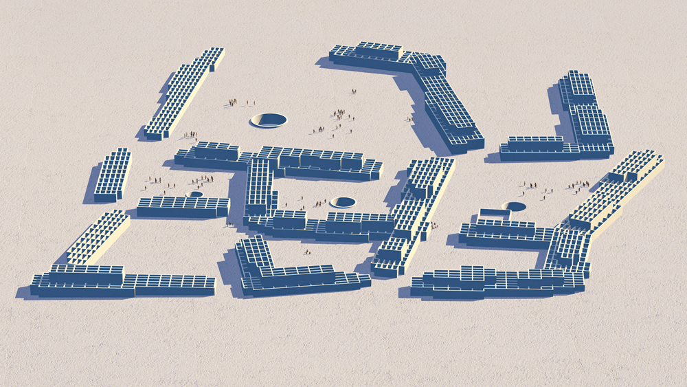 Photomontage of Pueblo She, upon an aerial photo of the actual site, looking east toward the Arroyo de la Jara.