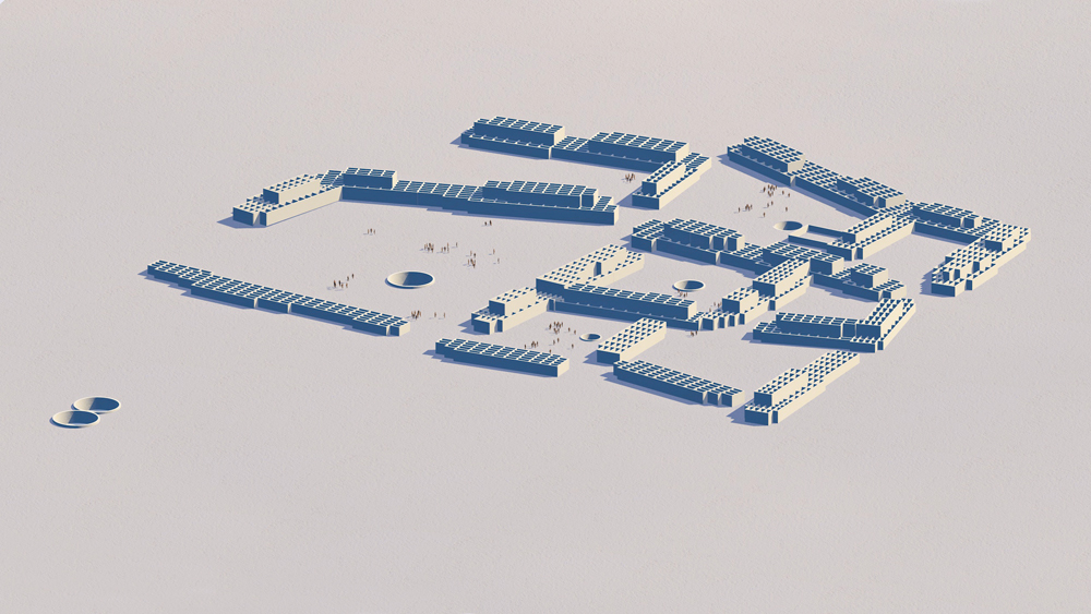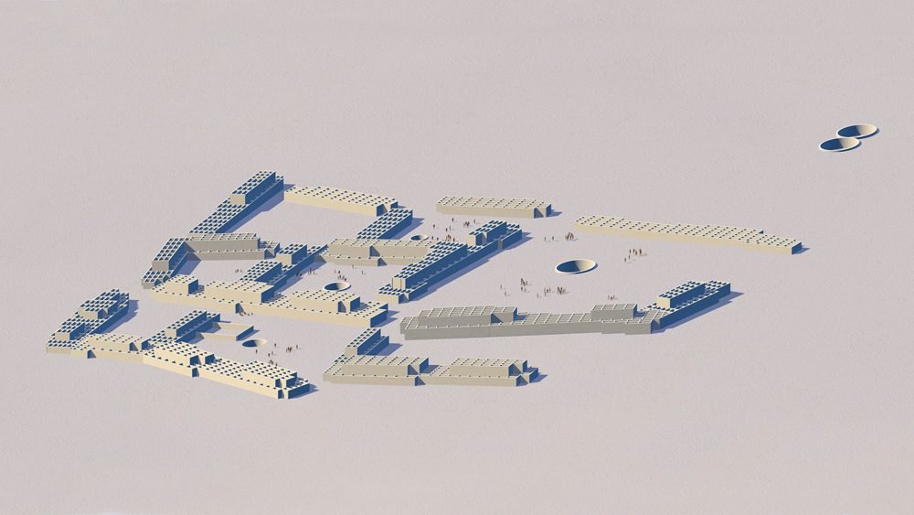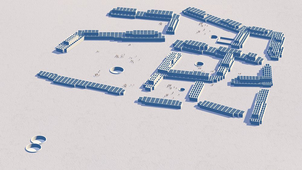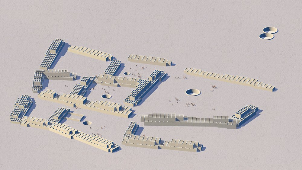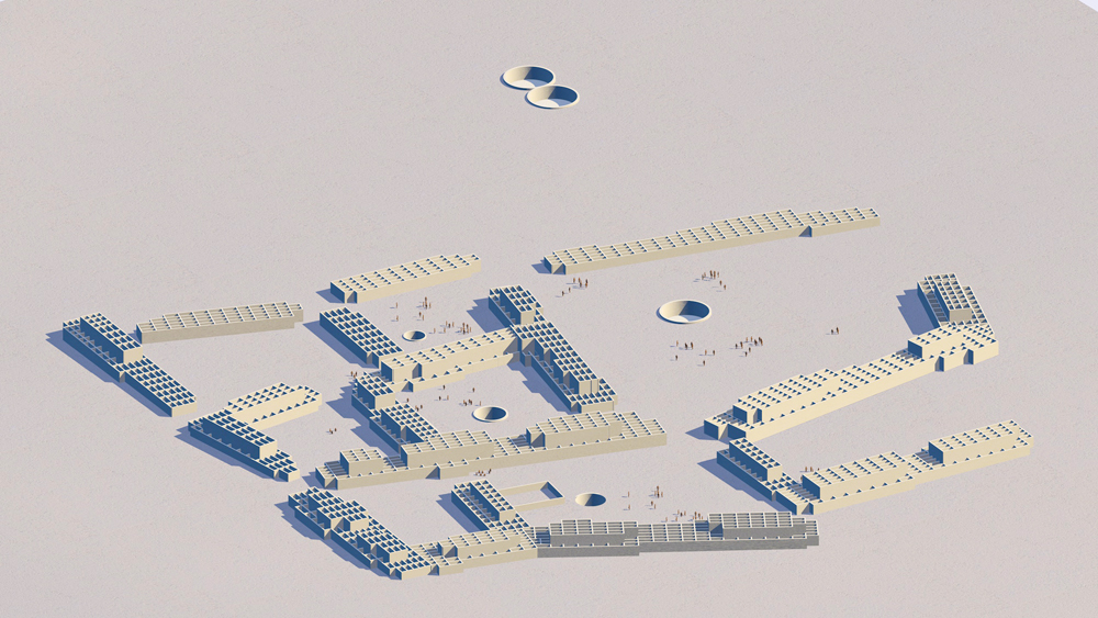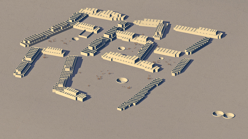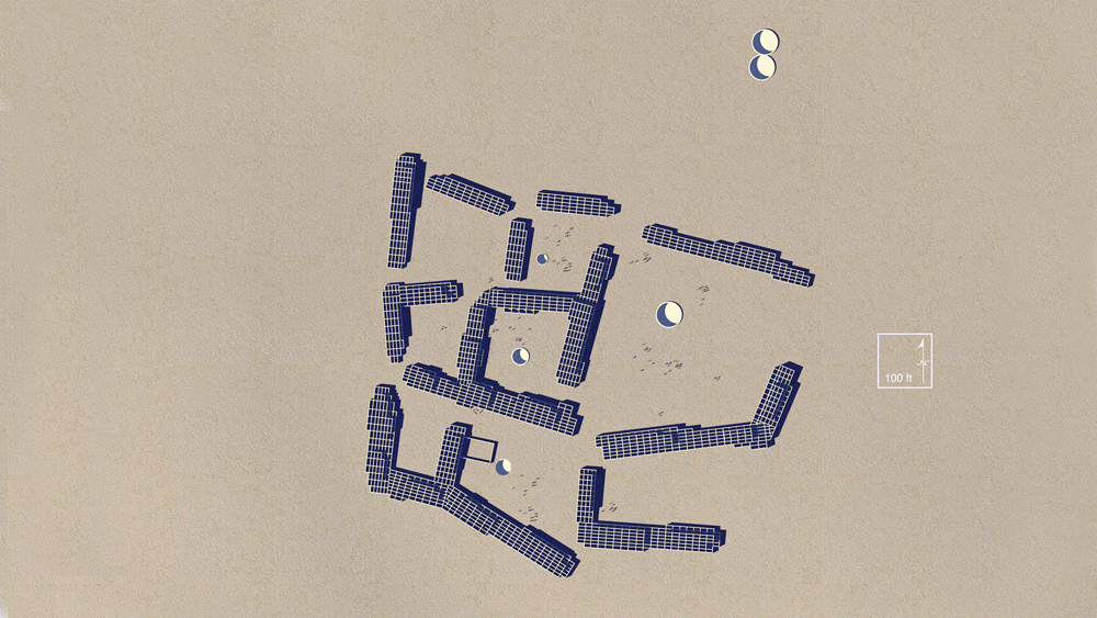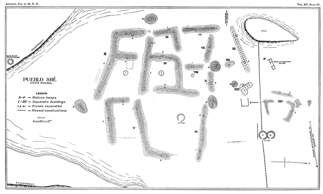 The plan view of Pueblo Shé with graphic scale and orientation. |