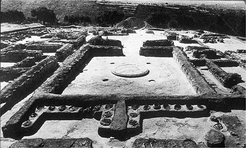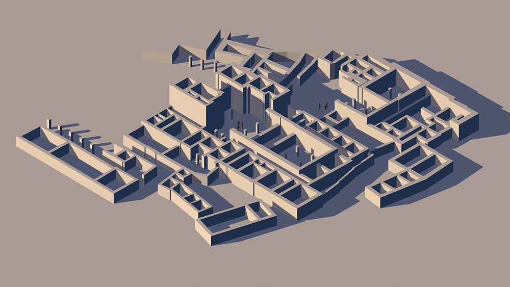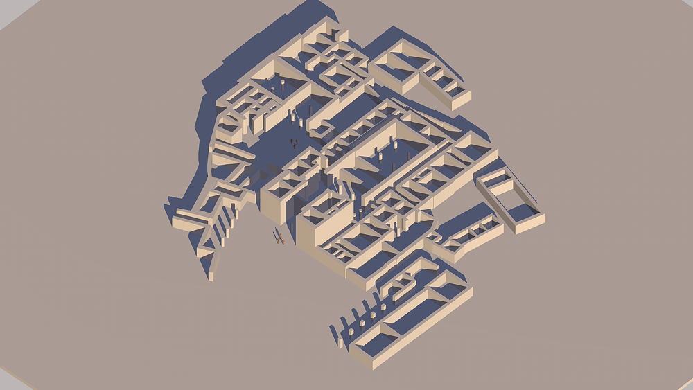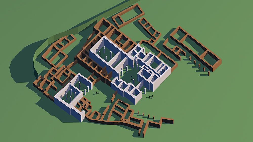 The Palace of King Nestor of Pylos, is the best preserved Greek palace form the Myceneaen Period, dating from 1300 BCE, and destroyed in a 1200 BCE fire, located in current Messenia, Peloponnese, Greece. The Palace was the central architecture of a wall-fortified Late Helladic era town. Within its two-story walls, the Palace contained reception rooms, kitchens, workshops, baths, storerooms, and had a sewage system. Its most important feature was a "Megaron" —a sophisticated architectural form accessed from a fore-courtyard, consisting of a porch with two symmetrical columns, an inner vestibule—and a large central hall, with a quadrangle of columns surrounding an open-roof heath, and a throne on a side wall. Megaron architecture was typical of Greek mainland palaces and private houses, and its formal origins have been traced to Greek Early Helladic settlements and earlier Neolithic settlements of Southwest Asia (see pages ). King Nestor's Palace at Pylos is described in Homer's telling of the Trojan War in The Odyssey and The Illiad. Early Classical Greek temples seem to have taken their plan form from the Megaron (see pages ). Elevation of Pylos above sea level is near sea level. Construction materials were stone walls, wood roof support and ceramic tile roofing. Data source for CG model: |