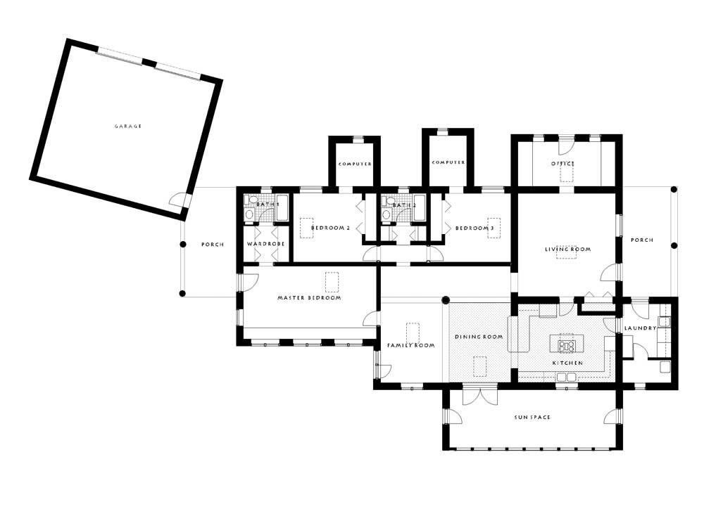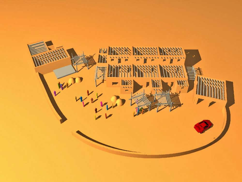A curved plaza wall connects an existing family home on the left with the proposed new residence. Computer model looking south. The "moo-oo"- like appendage rooms near the corndryers are children's computer study spaces, and are reminiscent in scale of the old Pueblo architecture nearby.