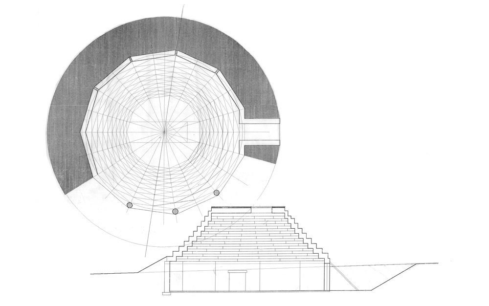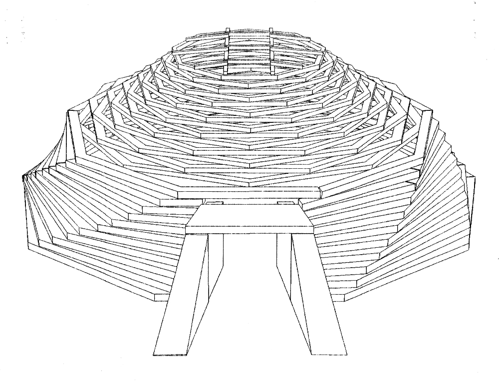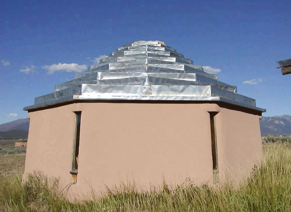 In 1990, the Los Angeles artist, Ronald Davis, phoned Dennis Holloway and inquired about the Colorado Solar Hogan Demonstration, in Boulder Colorado, which he had been reading about in the L.A. Times. The result was a collaboration between artist and architect for a new Taos, NM, Davis Residence and Studio (initally called the "Buck Westwood" Studio--for a mythical western hero, loved and admired by all-- including Native Americans!) The artist was enamored with the Navaho hogan idiom--especially the crib dome--and had for years been doing art pieces directly relating to this profoundly spiritual Native American geometry. From inital discussions about the project at the site in Arroyo Hondo, Taos County, NM, and at a coffee house on a Malibu, CA, beach, the concept that evolved from innumerable napkin sketches, called for a series of autonomous traditional and modern polygonal hogans that varied in the number of sides from five to twelve, and are not linked together or connected by corridors.. Each hogan contains a different function and is not connected to other hogans by corridors or interior space connections. Each hogan stands free in space. Each has an entry door facing the traditional east--which coincidentally, is the direction towards the spiritual focus of Taos Valley--Wheeler Peak, known by the locals as . The building program of spaces evolved to contain each functional space in a varying polygon form in the following schema: guest kitchen--six-sided Today, only the first phase of construction is completed. Local materials of pumice-crete (volcanic beads mixed with a small amount of cement), adobe bricks and plaster, and vigas (logs) are the primary media for the architecture. The artist has expanded the depth of the composition by placing his polychrome crib-dome sculptures, Hondo Spirit Hogans, contiguous to the complex of hogans--resulting in a lyrical art field on the edge of the Rio Grande Gorge and near to Manby hot springs. The project, originally unique to the Taos Valley, has inspired other people, in the neighborhood to mime the hogan theme.