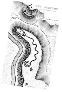 Above left: Squier and Davis's 1848 Ancient Monuments of the Mississippi Valley, plate XXXV. Adena Culture ancestral site, constructed 321 B.C.E.; located on a plateau of the Serpent Mound crater, a meteorite impact structure, along Ohio Brush Creek several kilometers north of Peebles, Ohio. Serpent Mound is the world's largest serpent effigy mound. Archaeologist have found no burials or artifacts. The head of the serpent is aligned to the summer solstice sunset and the undulations of the coils also may point to the winter solstice sunrise and the equinox sunrise. Elevation is 233 meters (766 feet) above sea level. Materials: a layer of yellowish clay and ash , reinforced with a layer of rocks, and covered with a layer of soil. Data for CG model: |
