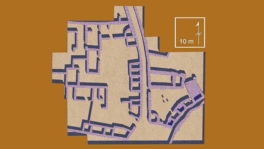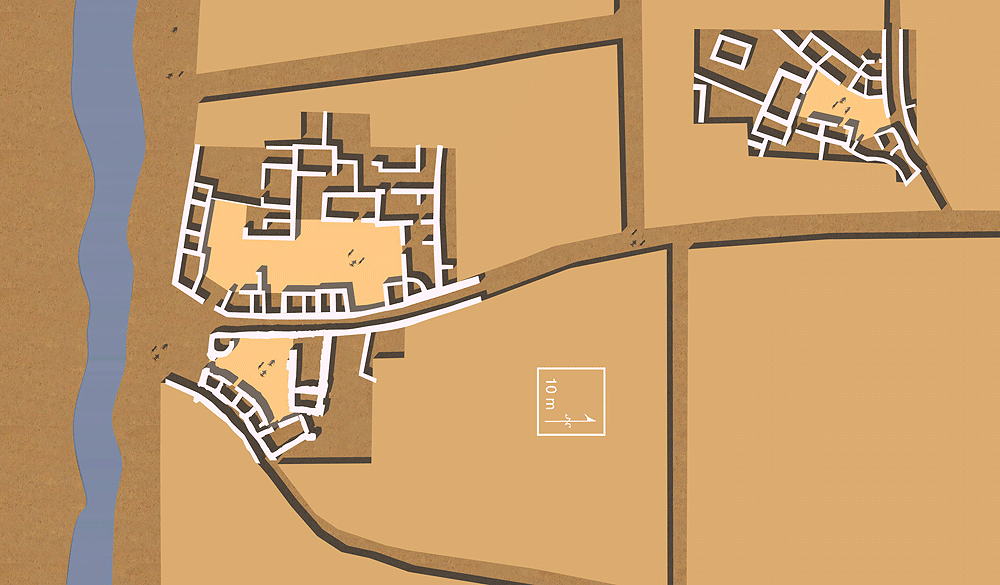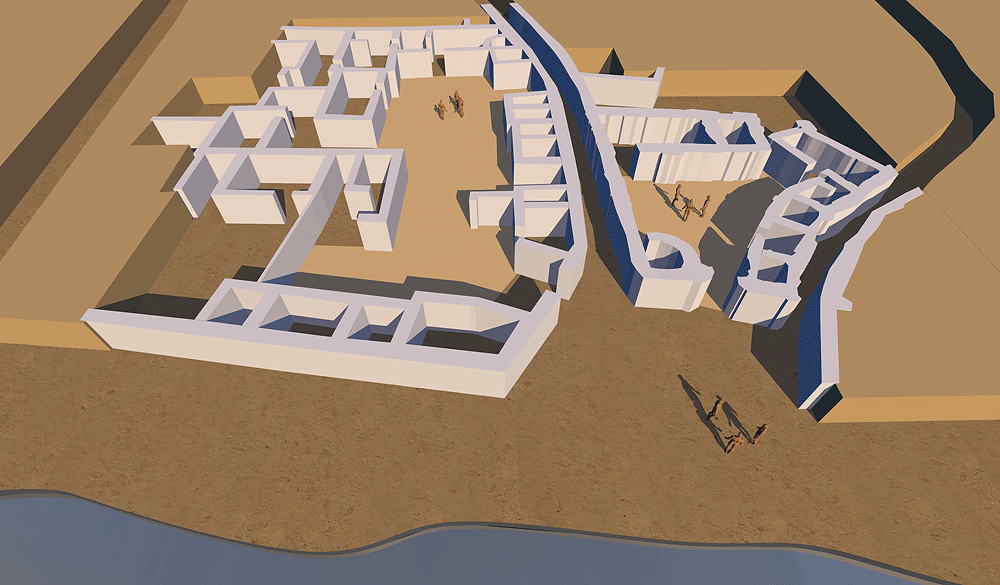Prehistoric Israel's first culture, the Yarmouk, founded the village of Shar'ar HaGolan in the Pottery Neolithic A (PNA), c. 6400-6000 BCE, is located central Jordan Valley on the northern bank of the Yarmouk River. The Yamoukian culture was one of the oldest in the Southern Levant and one of the first to make use of pottery. Sha'ar HaGolan was a permanent village composed of very large courtyard houses ranging in area between 250 and 700 m² (2700 ft² and 7500 ft²). The houses consist of central courtyards surrounded by small living, work, and storage rooms. This is significant in the history or the architecture of ancestors, because this site is the first appearance of the courtyard house — the prototypical traditional house type of all Mediterranean societies. Houses had both circular and rectangular rooms. Extended families apparently occupied these monumentally scales houses was the result of population growth pressure of the age. A hierarchical matrix of pedestrian movement composed of pebble-paved streets, some 3 m. (10 ft.), and narrow winding alleys 1 m (3 ft.) wide passing between the houses is evidence of sophisticated community planning, and are the earliest streets found in Israel, and among the earliest streets anywhere. Three levels of social organization and site planning are evidenced at Sha'ar HaGolan: Elevation is 200 m. (656 ft.) above sea level. Construction materials: walls of loaf-shaped mud bricks, on fieldstone masonry foundations, with roofs of straw-stabilized mud over wood beams and purlins. Source of data for CG model: |