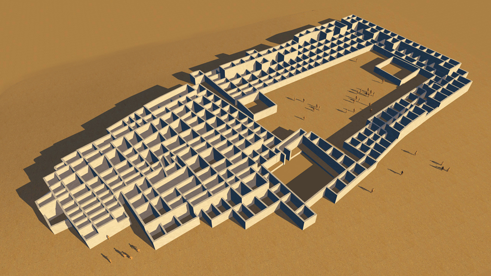 Above: Photomontage of Sherwood Ranch Pueblo CG model upon aerial photo of actual site in Arizona, looking east.. This digital reconstruction shows what Sherwood Ranch Pueblo might have looked like during the first occupation, from about A.D. 1150 to A.D. 1250: