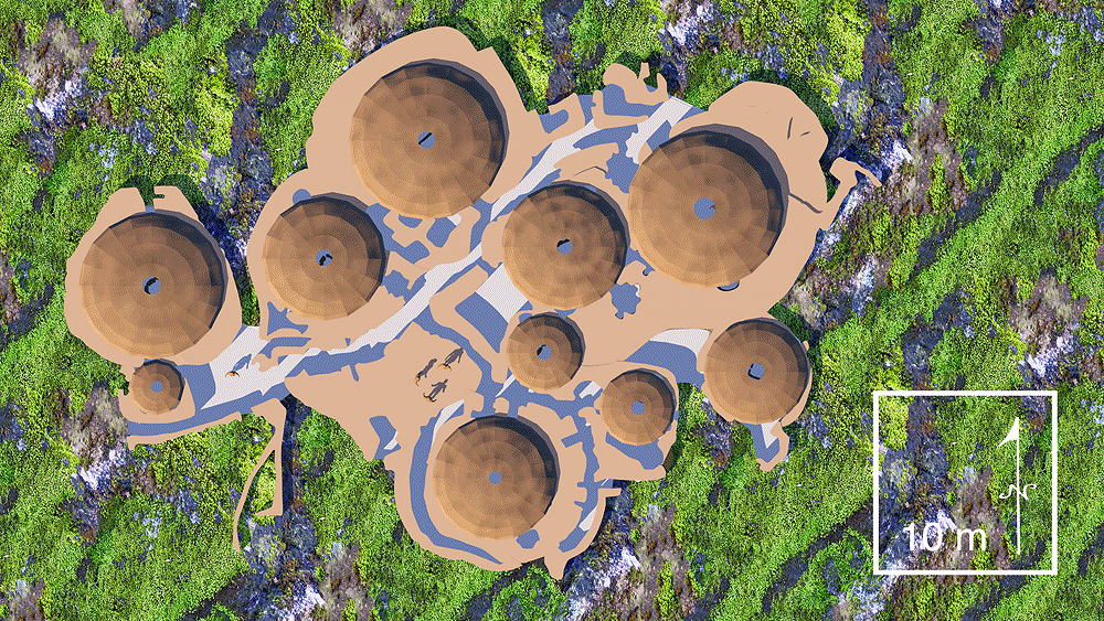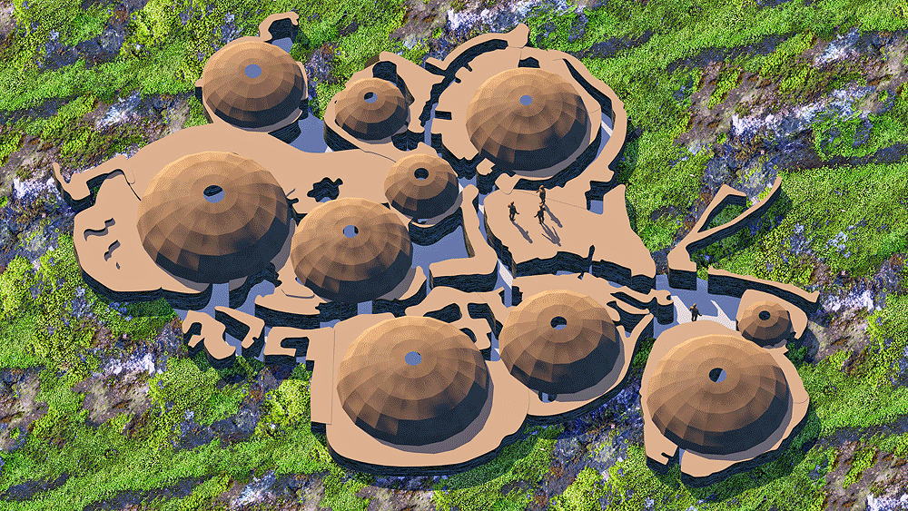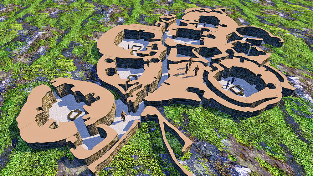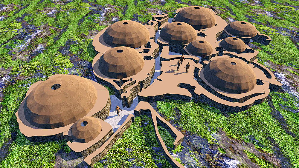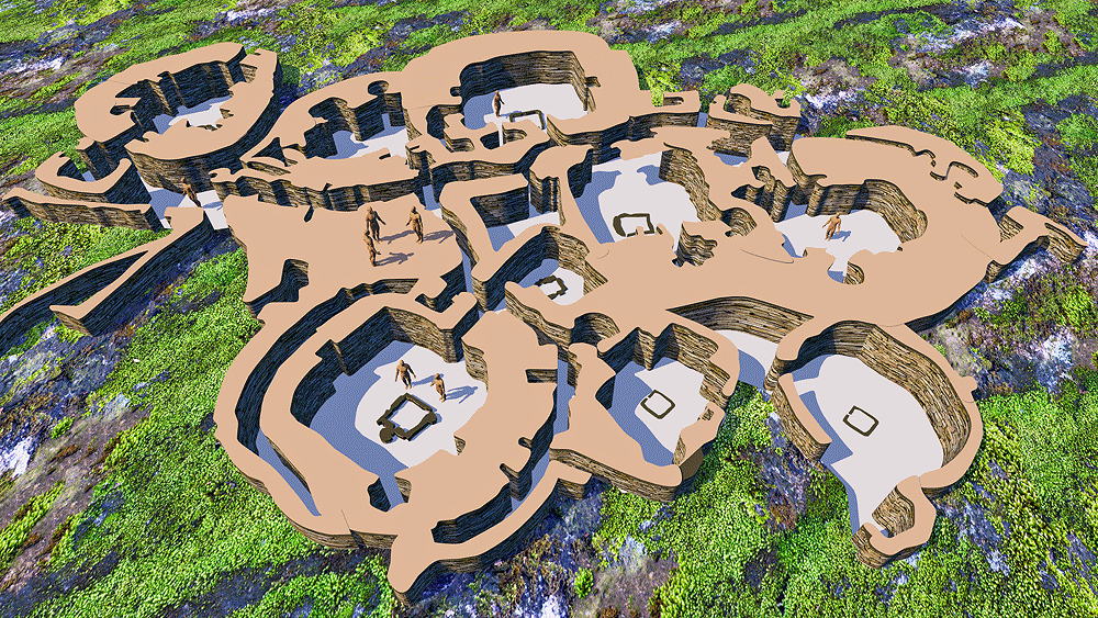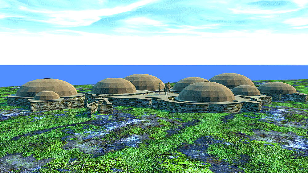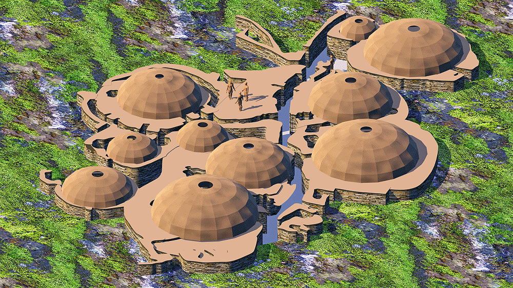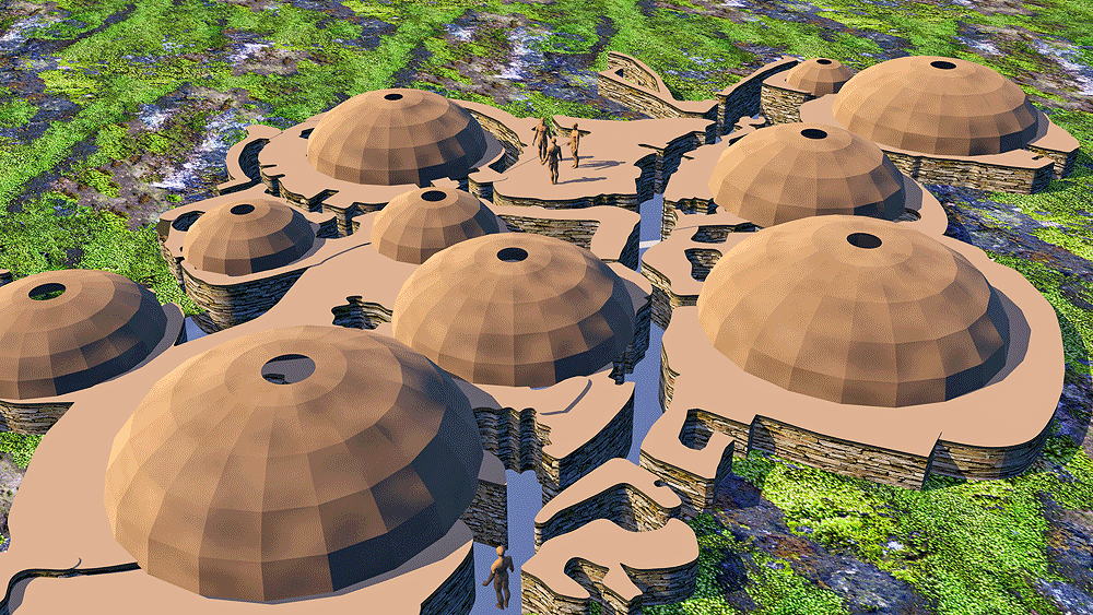 Culture of Grooved Ware People, a complex of houses, located on the Bay of Skaill on the west coast of Mainland, the largest island in the Orkney archipelago of Scotland, occupied 3180 B.C.E.–2500 B.C.E., (older than the Pyramids and Stonehenge), World Heritage Site. The eroding coastline has come very close to the ruin of the houses over the centuries since they were inhabited. Elevation is at coastal sea shore. Materials: stone walls in earth berms; wood roof structure; sod and thatch roofing. Data for CG model: