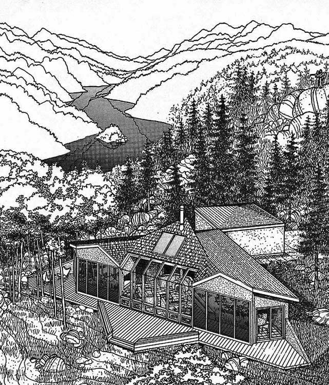 Soft House Competiton Design for a 1000 square foot, 2 bedroom house featuring Trombe walls and direct- gain fenestration. Analysis performed indicated the house would not require fossi fuel heating or mechanical ventillation. The design is a miniature one storey variation on the Champion passive solar house. |