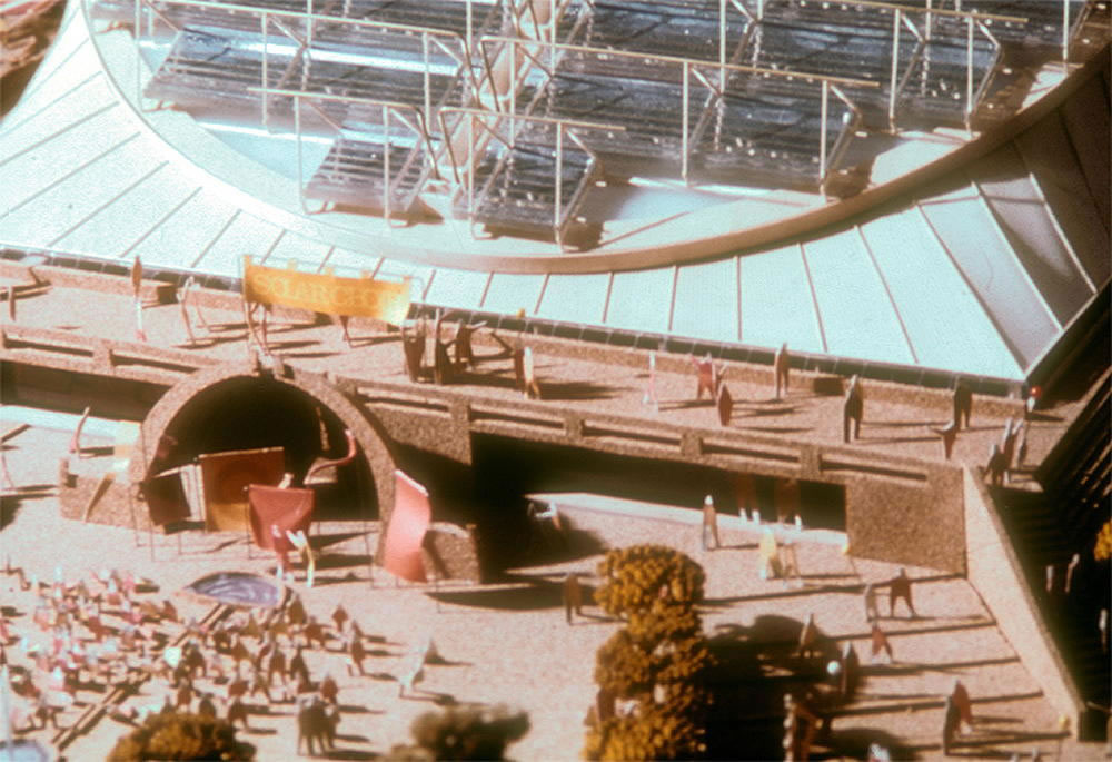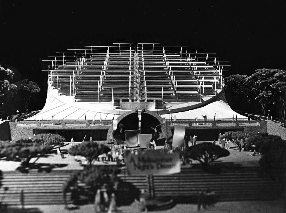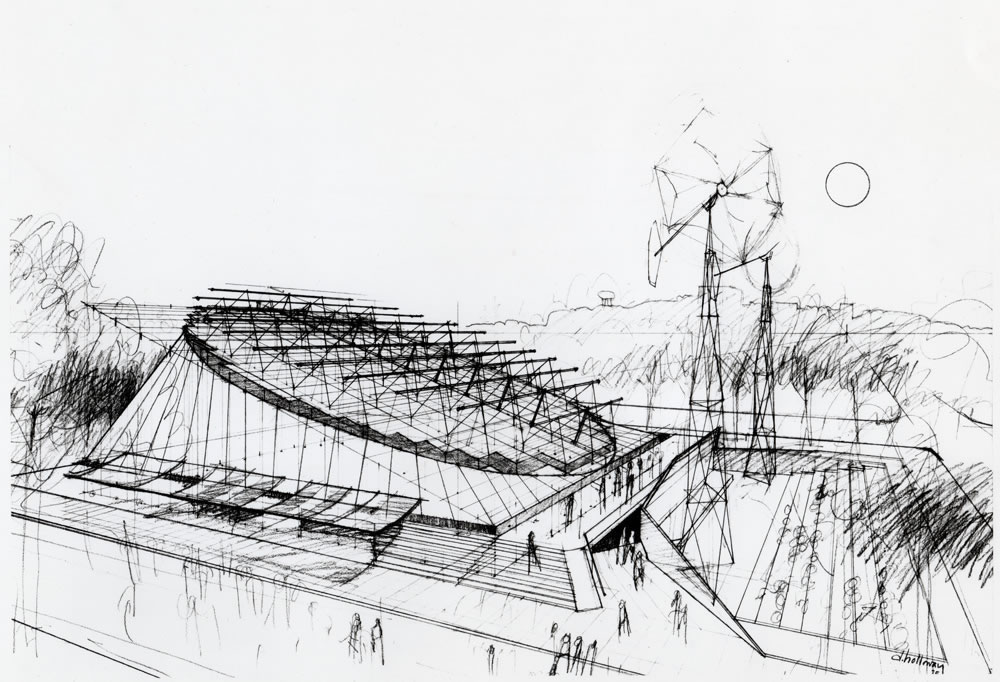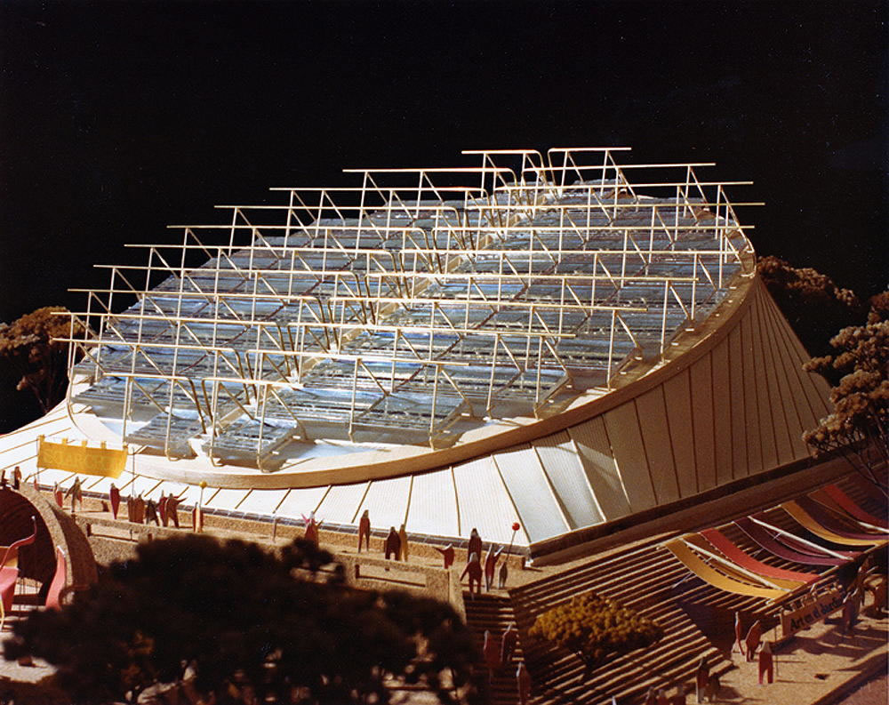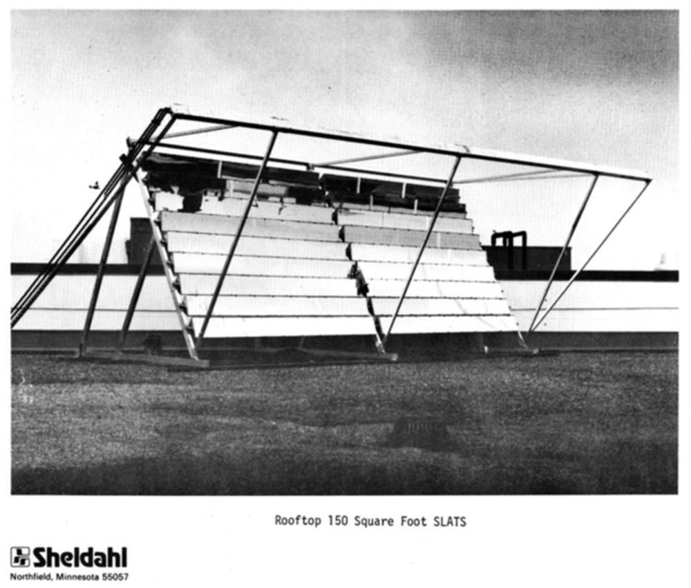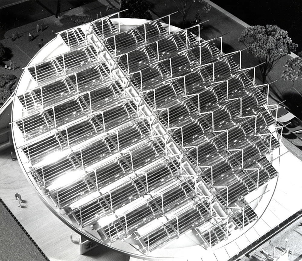In the 1970s the Sheldahl Corporation developed the SLATS focusing reflector system, shown here in prototype. Holloway incoporated this system into this proposal for the Minnesoa State Fair's Bicentennial Solar Pavilion for the Arts in 1976. The mirror array covering the circular roof of the art exhibition hall was engineered to provide supply for all ANNUAL CYCLE energy requirements of the architecture, including heating, cooling, and electric power.