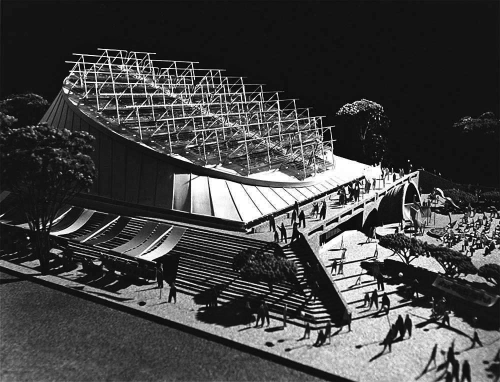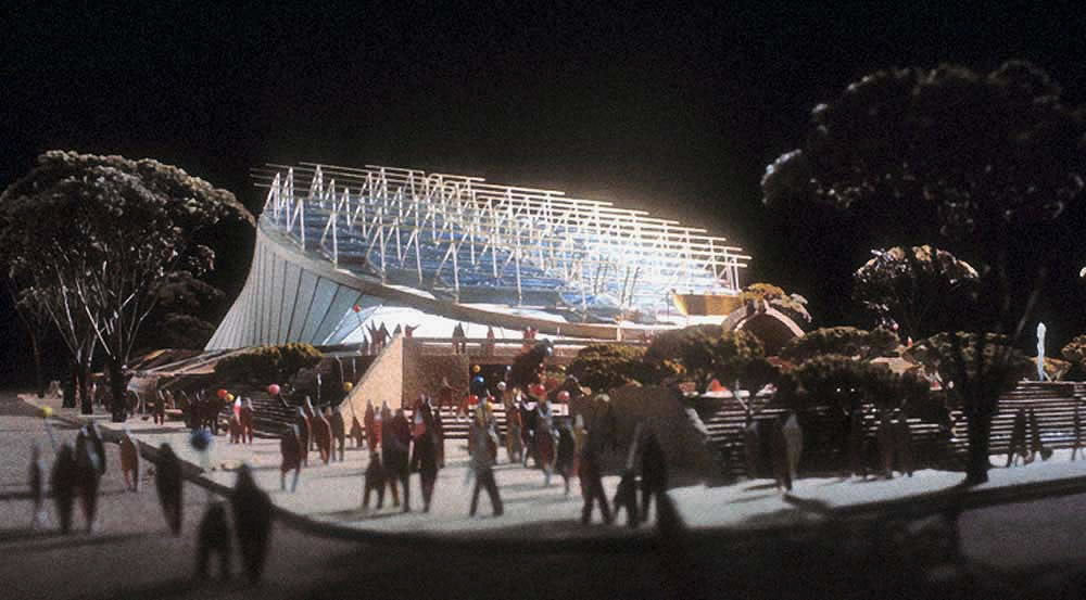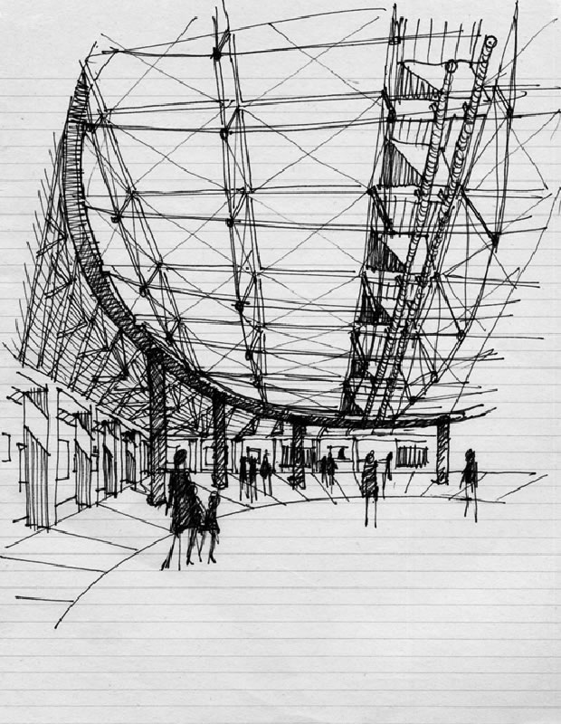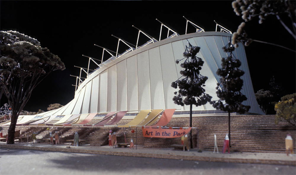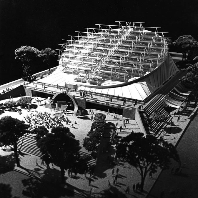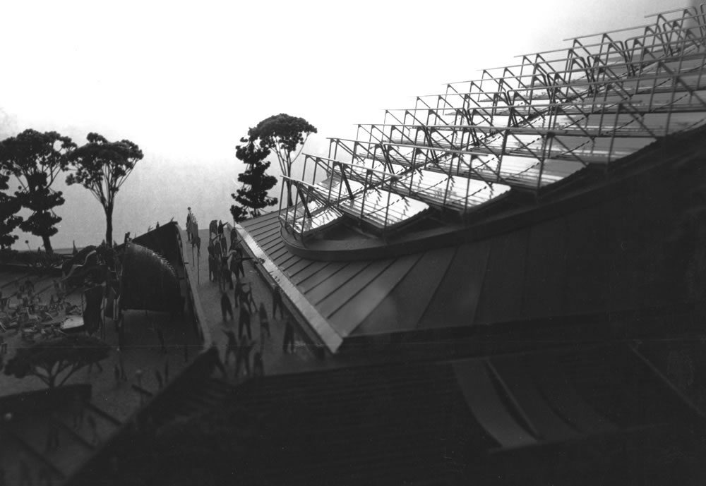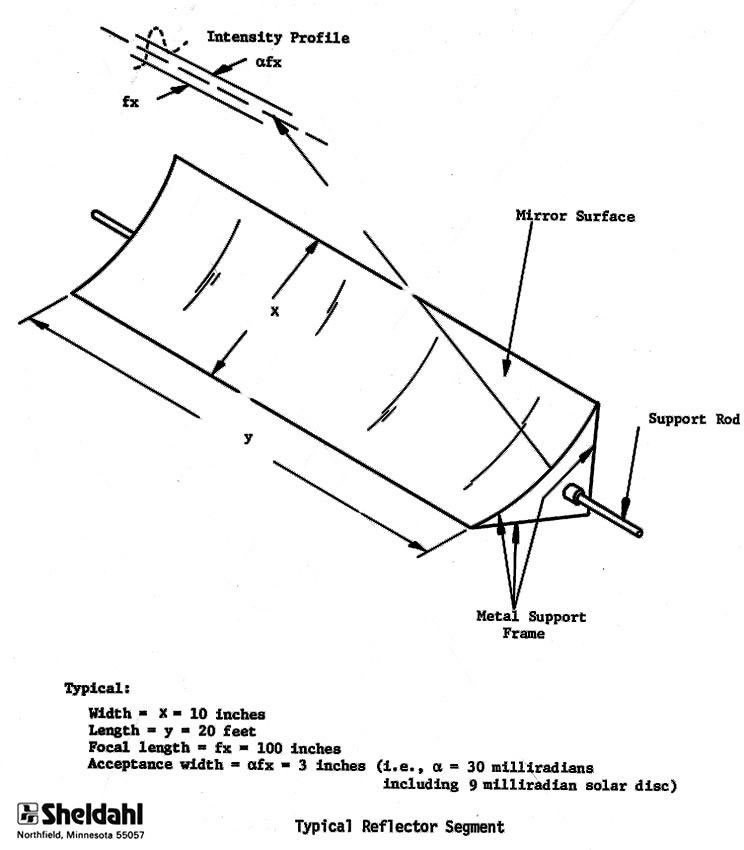 In the 1970s the Sheldahl Corporation developed the SLATS focusing reflector system, shown here in prototype. Holloway incoporated this system into this proposal for the Minnesoa State Fair's Bicentennial Solar Pavilion for the Arts in 1976. The mirror array covering the circular roof of the art exhibition hall was engineered to provide supply for all ANNUAL CYCLE energy requirements of the architecture, including heating, cooling, and electric power.