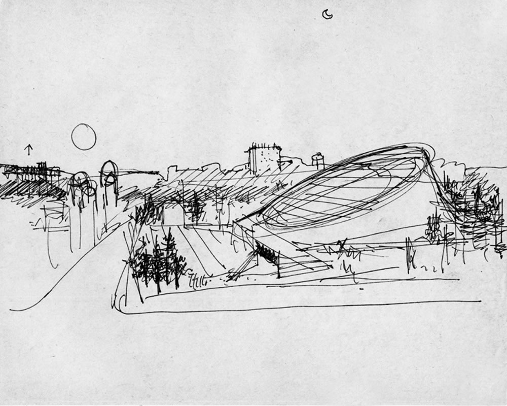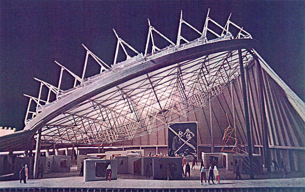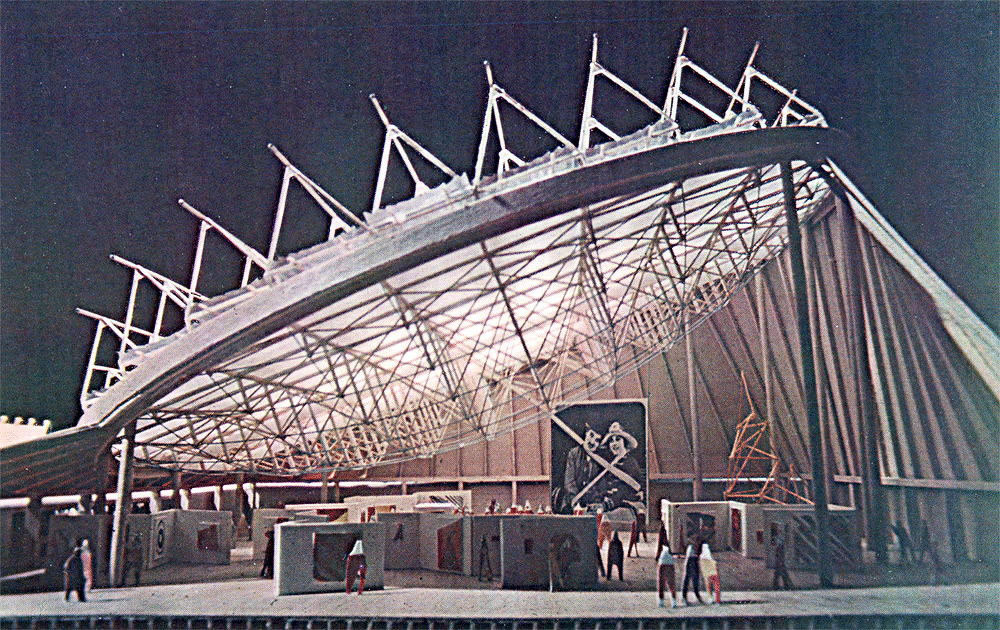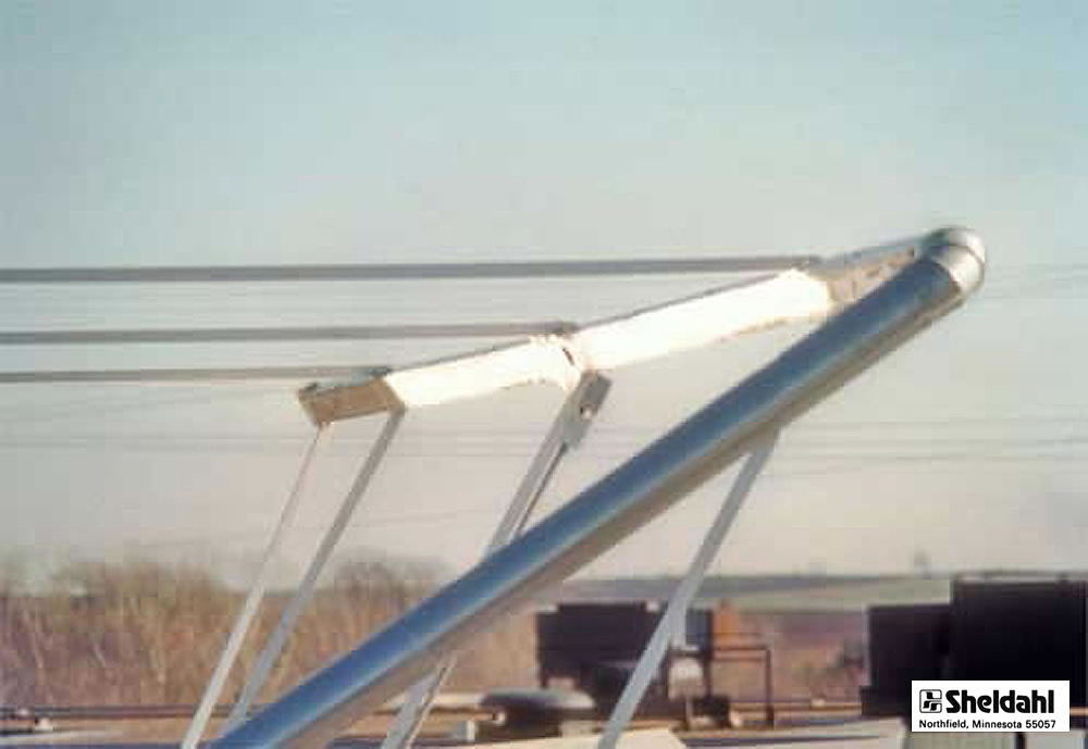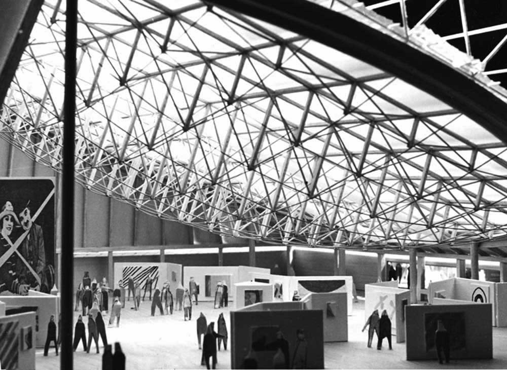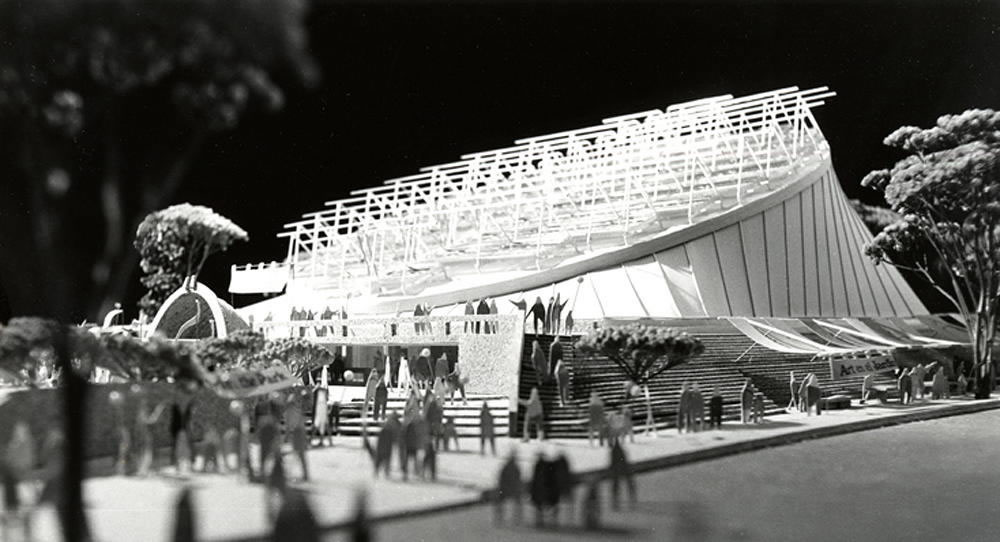 In the 1970s the Sheldahl Corporation developed the SLATS focusing reflector system, shown here in prototype. Holloway incoporated this system into this proposal for the Minnesoa State Fair's Bicentennial Solar Pavilion for the Arts in 1976. The mirror array covering the circular roof of the art exhibition hall was engineered to provide supply for all ANNUAL CYCLE energy requirements of the architecture, including heating, cooling, and electric power.