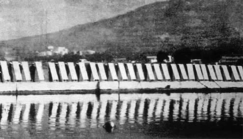 Photograph of an experiment by Dr. Ioannis Sakkas, in which he lined up 60 Greek sailors who each held a mirror angled to reflect sunlight onto a small wooden boat 160 feet away in the harbor. The boat was ignited instantly, thus giving credance to the ancient Archimedes legend.