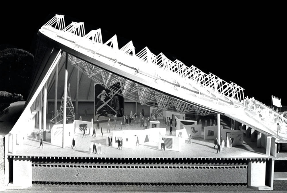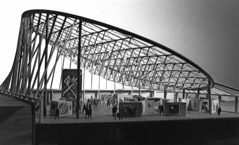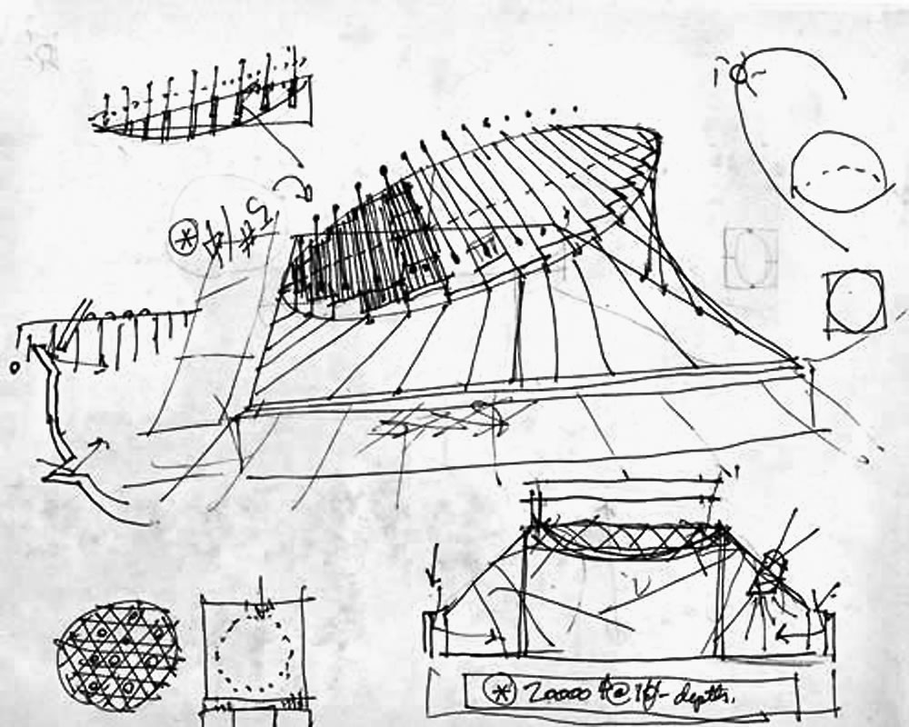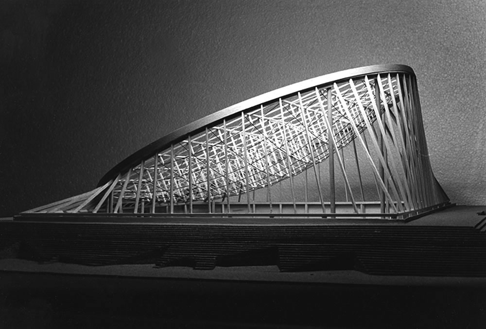 View to the interior of the Solar Pavilion Project scale model, showing the catenary truss " lens" supporting the rooftop array of sun-focusing mirrors. The roof edge ring is supported by columns, and the exhibition space is enclosed on the perimeter by a non-load bearing skirt between the low wall and the roof ring.