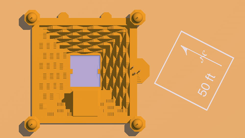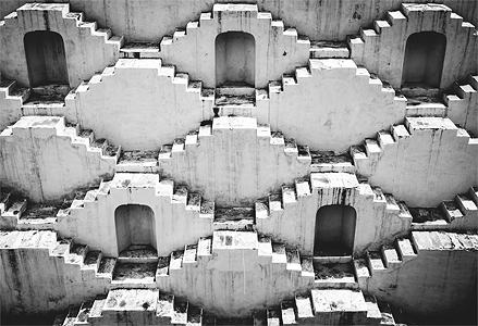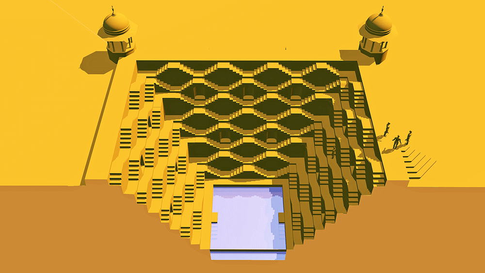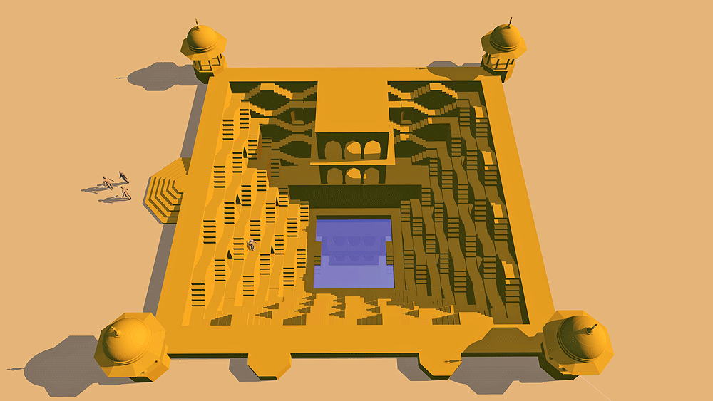 India Hindu civilization, built c. 1550 CE in Jaipur, India. These man-made ponds, significant ornamental architectural structures, are excavated eight stories (or more) into the earth to capture and store ground and rain water for irrigation, bathing, and washing, to cope with seasonal rain fluctuations in an arid region of India.; developed and used from third millennium BCE Mohenjo-daro civilization, to present. The step wells of India were originally for religious and ceremonial purposes, and eventually became a community and political focus for village women, the traditional water carriers. The designs of step wells feature intricate geometrical labyrinthine stairways. Elevations is c. 432 meters (1416 feet) above sea level. Materials: stone. Data for CG model: |