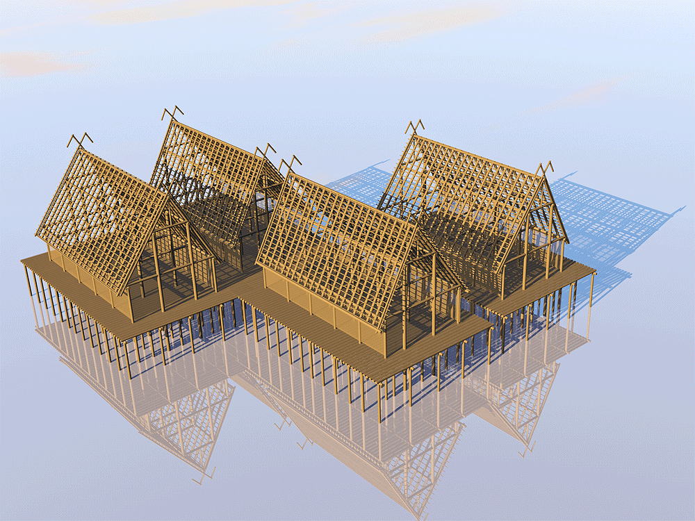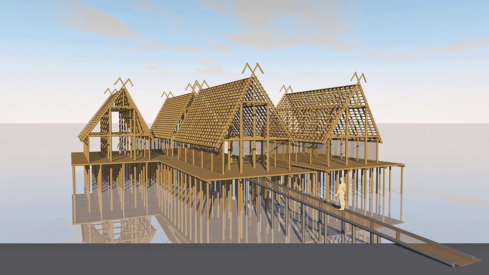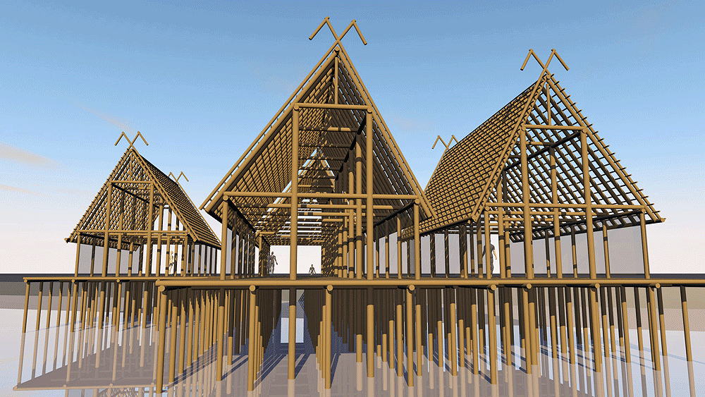 Ancestral Bronze Age Culture of Austria, France, Germany, Italy, Slovenia, Switzerland, in and around the Alps. In use in lake edge marshes from 5000 B.C.E. to 500 B.C.E. The model presented here is a UNESCO WORLD HERITAGE SITE, at Uhldingen-Mühlhofen, Lake Constance, Germany. Elevation of the Lake is 394 meters (1294 feet) above sea level. Materials: wood piers, floors, walls, and roof structure; thatch roof. |