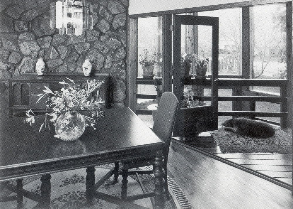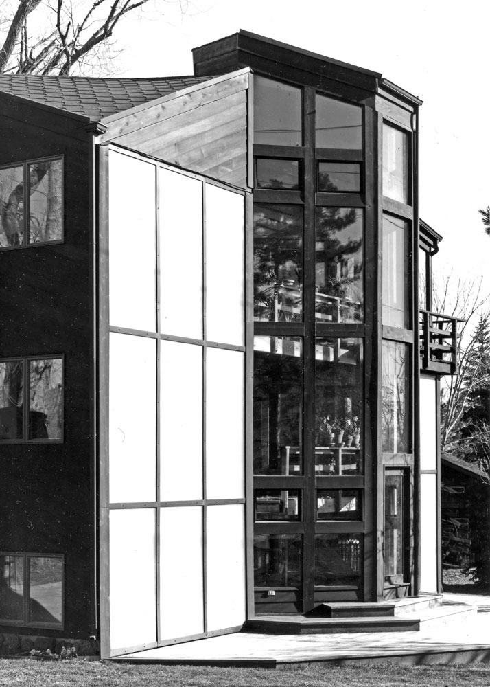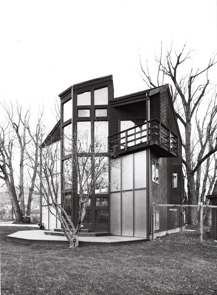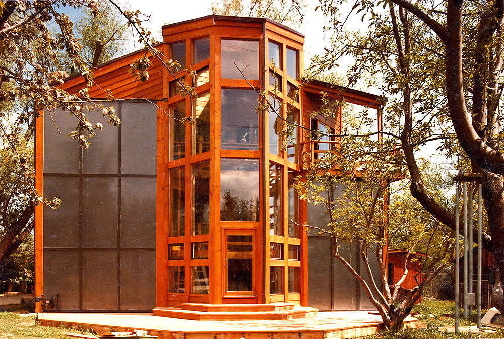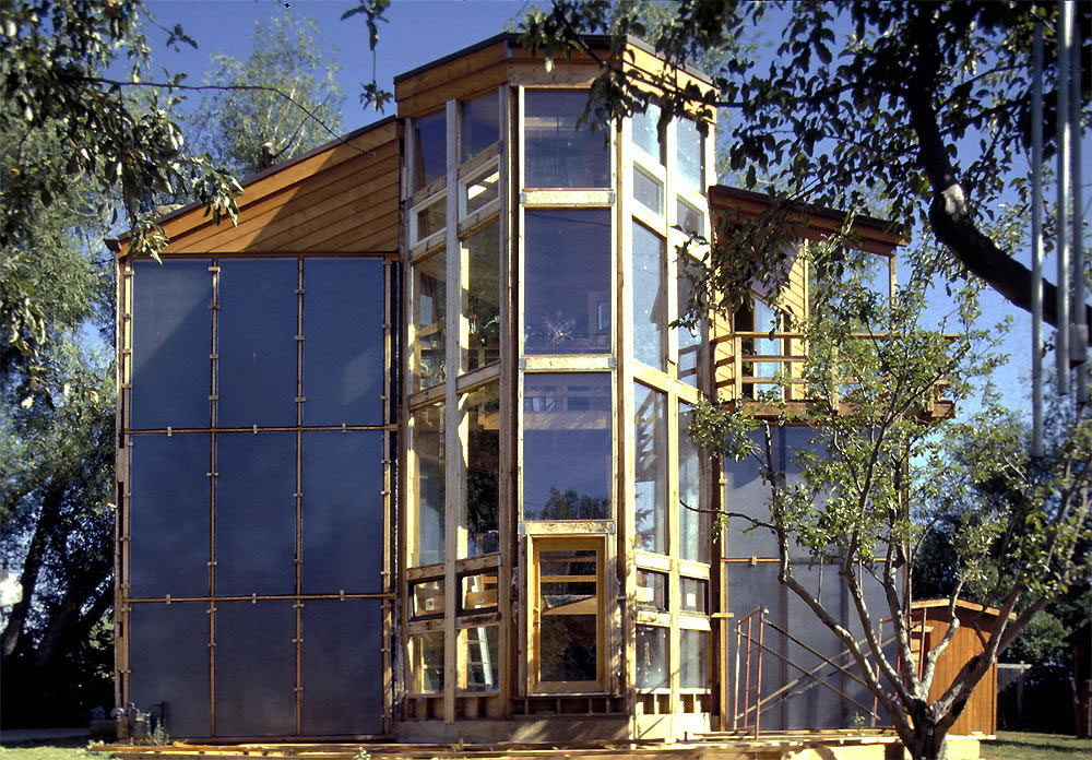 Stricklin Residence, Boulder, Colorado, 1983 The design of the Stricklin residence consists of three storeys incorporating two Trombe walls and direct gain passive solar fenestration of the passive solar tower. Operable windows of the tower provides gravity lift of the air column that naturally ventillates the house during summer months. |