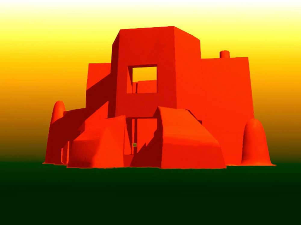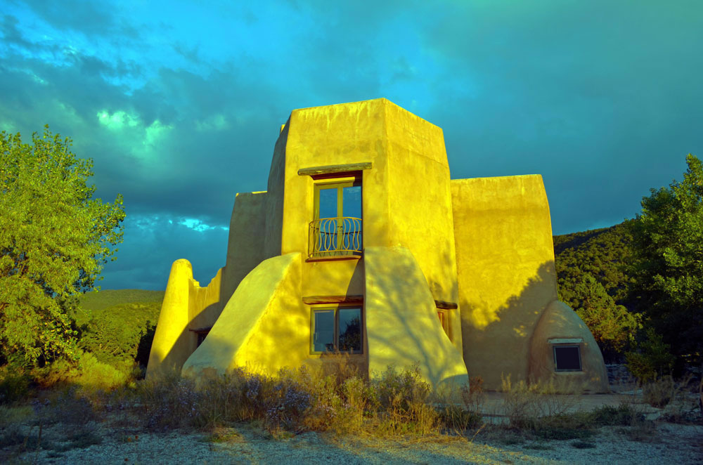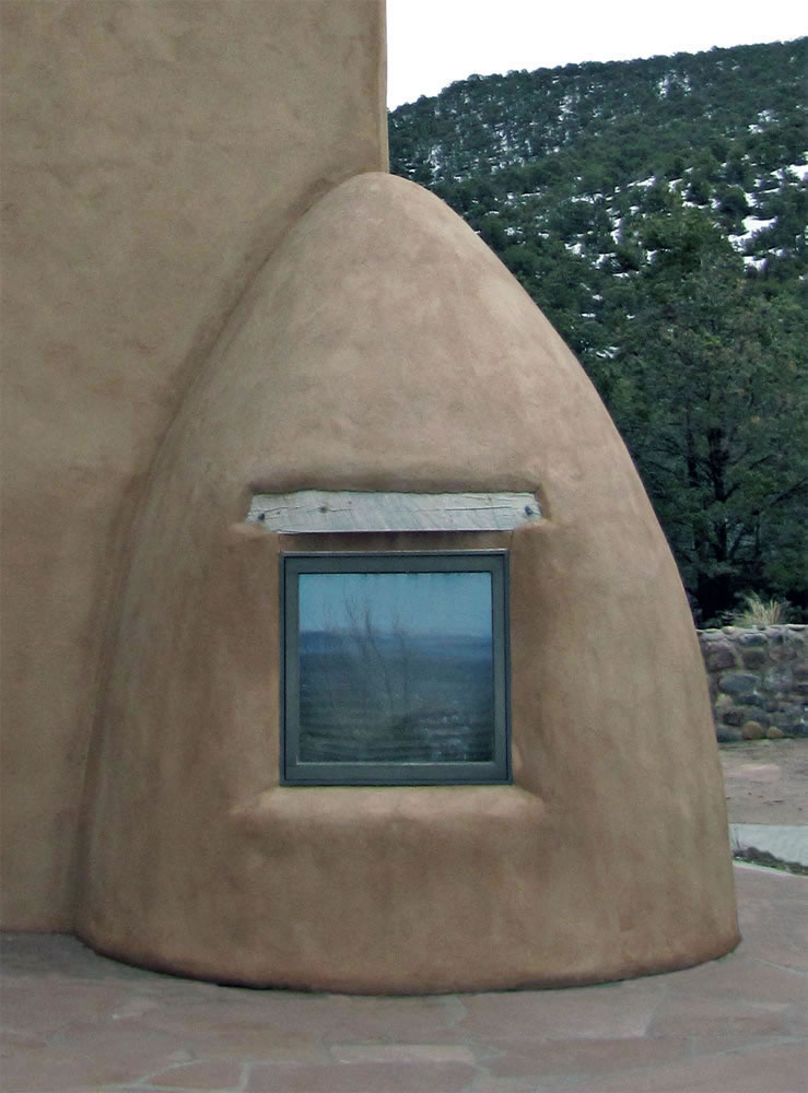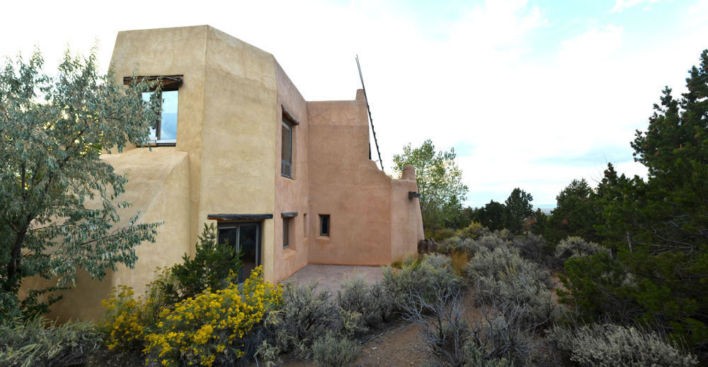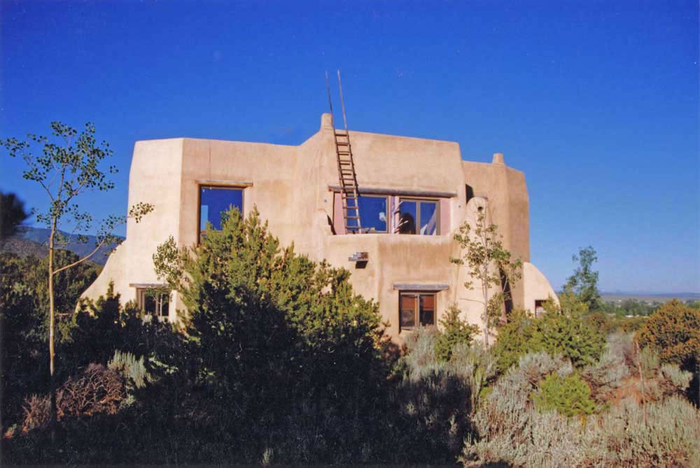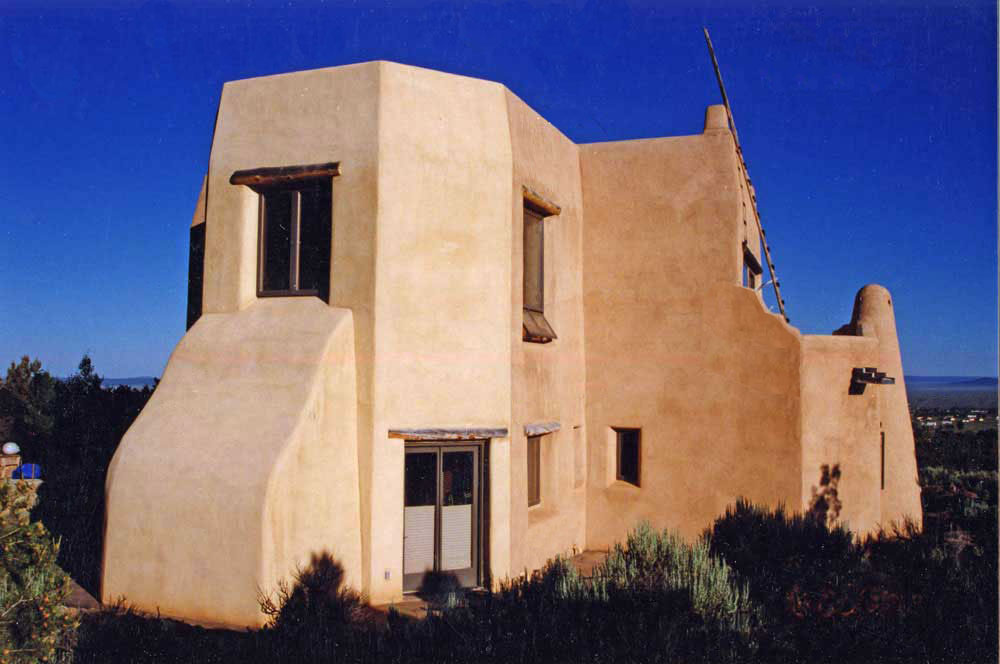 Rancho de Talpa: Strong-Dimond Artist Studios & Residence, Talpa, New Mexico, 1991 For Artist Charles Strong and Writer Mag Dimond The client, Charles Strong, requested a design reminiscent of the old church in Ranchos de Taos, St. Francisco de Asis. The program called for a personal residence, main painting studio, guest quarters, and additional painting/writing studio (for Mag)--a complex program in a small space. The resulting design is 3000 square feet on two levels, with double adobe walls insulted with an inner layer of loose pumice (locally sourced volcanic lava beads). The reinforced buttresses are hollow and are used for seveal interior and exterior storage spaces, a bed alcove in the guest quarters (end of east wing), a love-making cave (left side of south wing), and a doghouse (right side of south wing). See House Plan. There are no right angles or parallel lines in the building, which was designed on a Macintosh computer without any pencil or manual tool drawing whatsoever. The adobe construction of the project was performed by a crew composed equally of local Taos Hispano and Taos Pueblo builders.