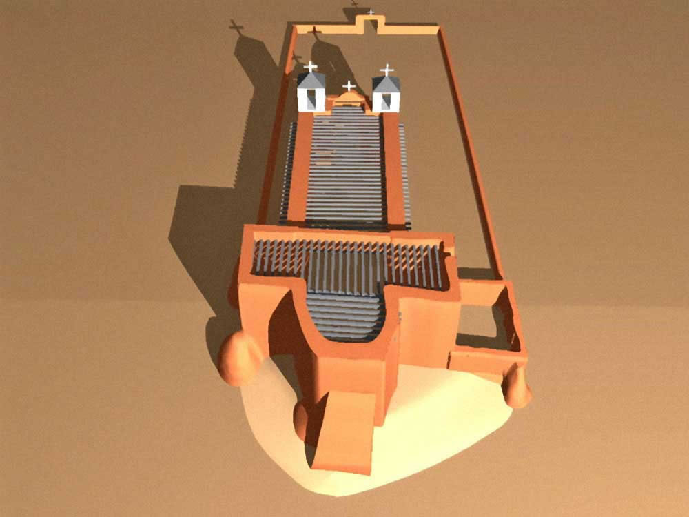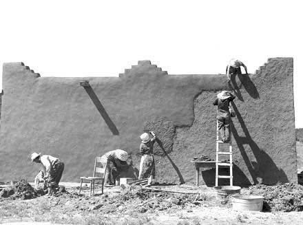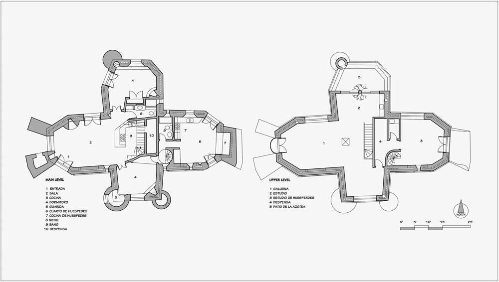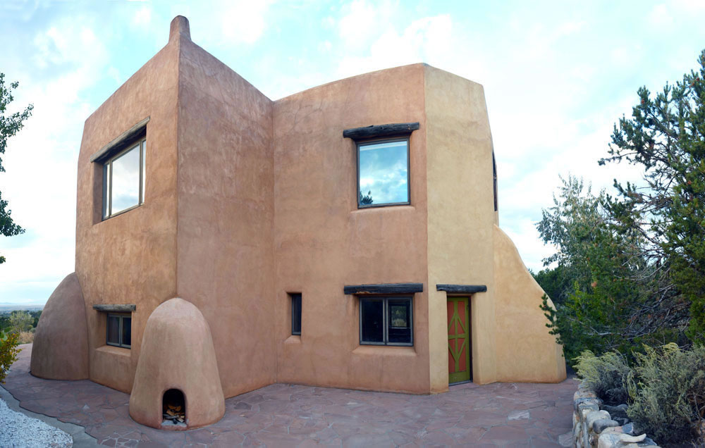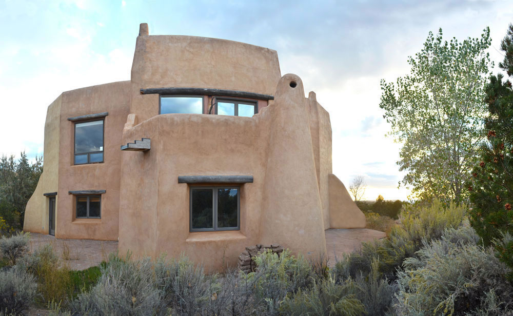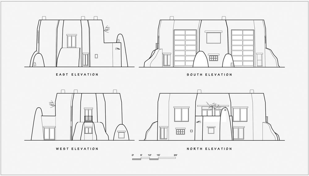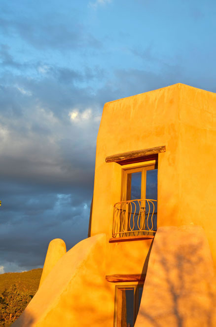 Rancho de Talpa: Strong-Dimond Artist Studios & Residence, Talpa, New Mexico, 1991 For Artist Charles Strong and Writer Mag Dimond The client, Charles Strong, requested a design reminiscent of the old church in Ranchos de Taos, St. Francisco de Asis. The program called for a personal residence, main painting studio, guest quarters, and additional painting/writing studio (for Mag)--a complex program in a small space. The resulting design is 3000 square feet on two levels, with double adobe walls insulted with an inner layer of loose pumice (locally sourced volcanic lava beads). The reinforced buttresses are hollow and are used for seveal interior and exterior storage spaces, a bed alcove in the guest quarters (end of east wing), a love-making cave (left side of south wing), and a doghouse (right side of south wing). See House Plan. There are no right angles or parallel lines in the building, which was designed on a Macintosh computer without any pencil or manual tool drawing whatsoever. The adobe construction of the project was performed by a crew composed equally of local Taos Hispano and Taos Pueblo builders.