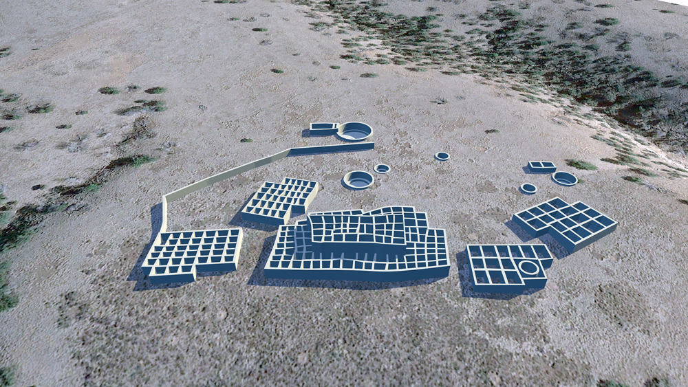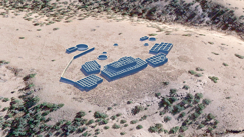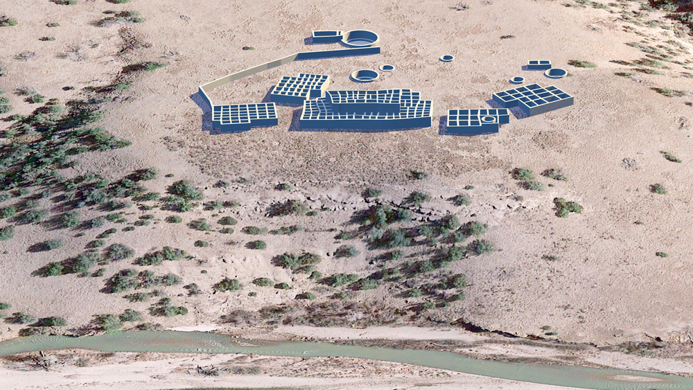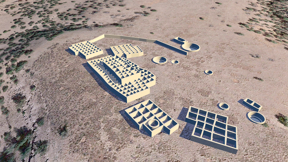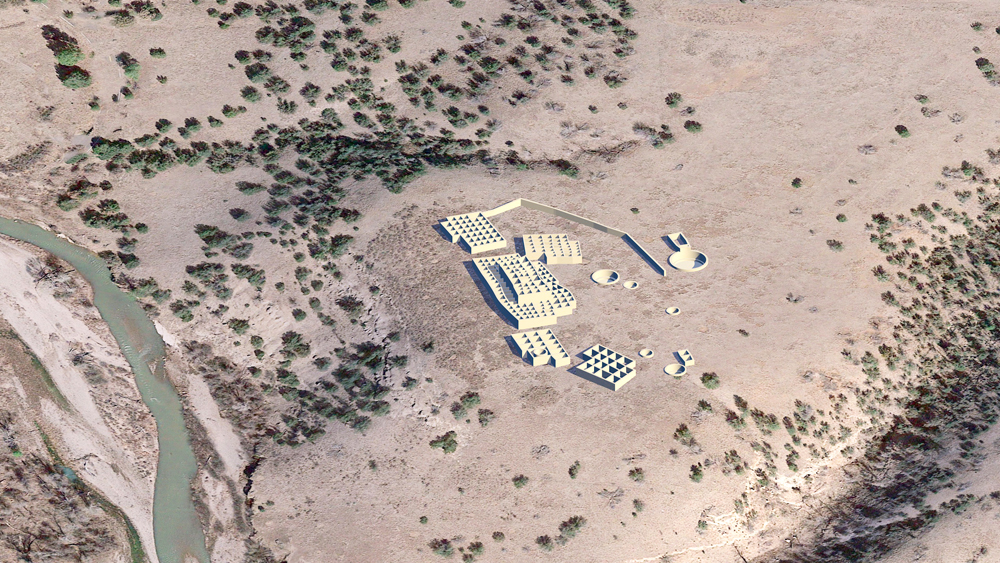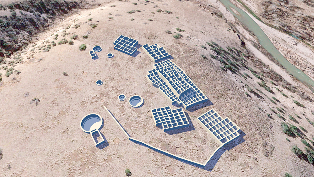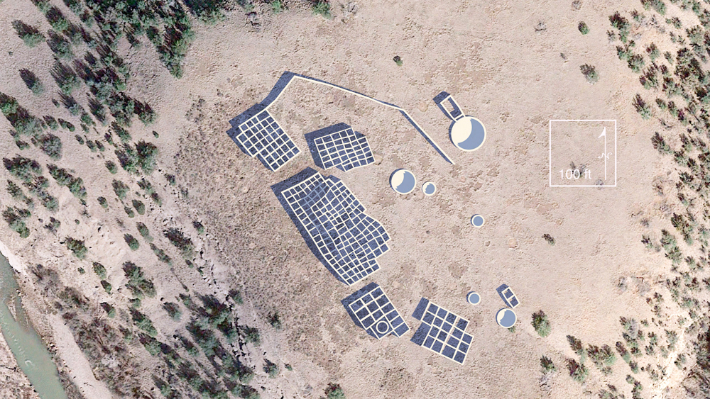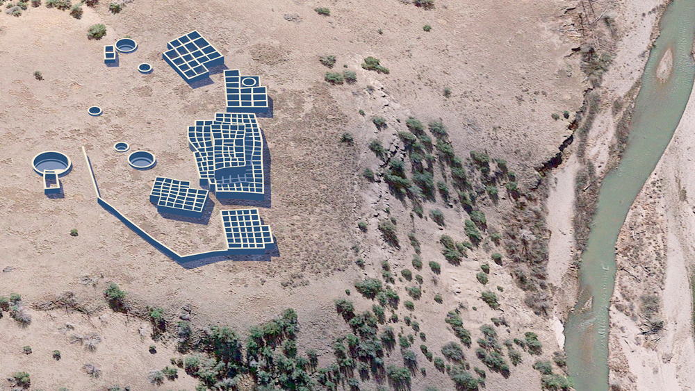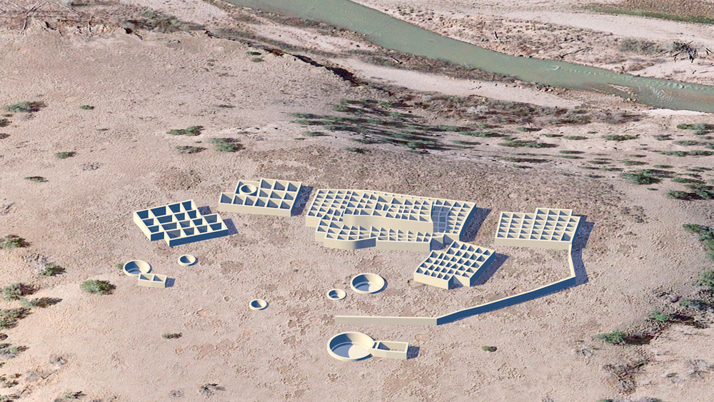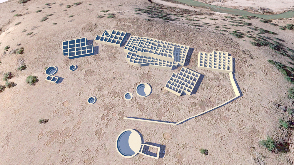 Photomontaage of CG model on aerial photo of actual site with scale and orientation. Data for CG model: 2. Gila Cliff Dwellings: https://www.nps.gov/parkhistory/online_books/gicl/adhi/adhi4g.htm 3. Morgan, William N. Ancient Architecture of the Southwest. Austin: University of Texas Press, 1994. |