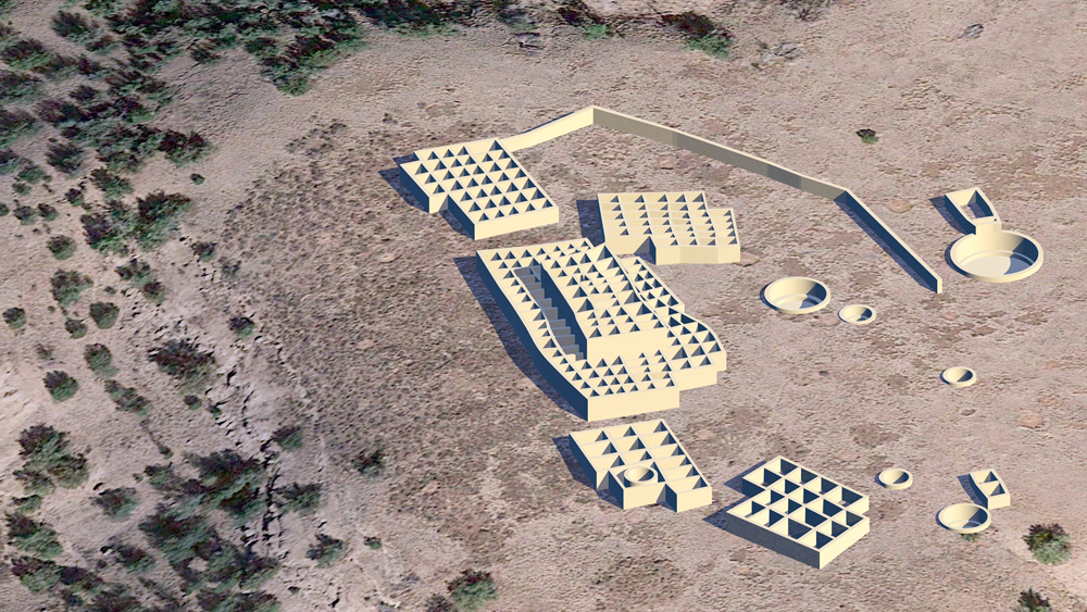 The ceramics collected on surface of the mounds of the unexcavated or trenched ruin indicate this Ancestral Mimbres pueblo was inhabited around 900 to 1150 C.E. The Pueblo appears to contain five masonry room blocks, seven kivas, and a large central plaza, bounded on the north by a 345 foot (105 meters) long masonry wall. A Great Kiva 52 feet (16 meters) in diameter is located at the end of this wall, forming a entrance into the village. The people were farmers, growing the "three sister" crops of maize, beans, and squash in the fertile soil of the flood plane, and also supported their diet with limited huntng and gathering. The room blocks are oriented parallel to the cliff edge, and not the cardinal directions. The plan reconstructec by William Morgon on which this CG 3d model is based proposes 245 main floor rooms and 36 second floor rooms in the five room blocks. There probably were many subsurface pit houses inhabited by Mimbres families in the immediate vicinity of the central pueblo. Elevation is 1756 meters (5775 feet) above sea level. Coordinates: 33°13'16.9"N 108°14'22.2"W Materials: Mortarless masonry and adobe roomblock and northside plaza walls, log roof support structure, and brush and wood purlin roof structure with compressed mud/clay topping.