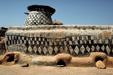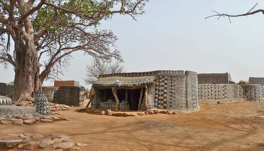 Kassena Culture, (Eastern Kassena region), Burkina Faso, indigenous; from pre-historic times, still in use. Elevation is c. 250 meters (1150 feet). Materials: Adobe, wooden columns and beams. Richly painted designs on all surfaces. Data for CG model: