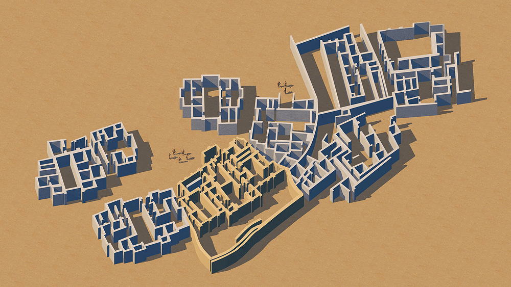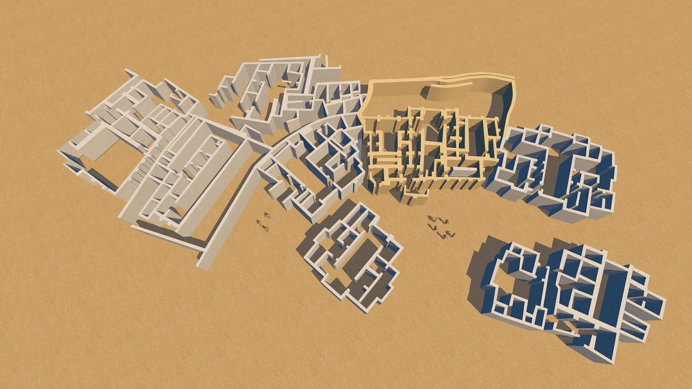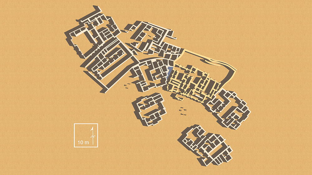 Tell Abada The site location is east of the Diyala River, Hamrin region east of Bagdad, along the Zagros foothills bordering the eastern frontier of present day Iraq. Archaeological excavation was conducted to salvage information about the site, prior to inundation from the completion of a large nearby dam. The oval settlement site, 190 m long by 150 m wide, sits upon a mound 3.5m above the surrounding plain. Three main stratigraphic units number I-III were excavated on the top of the mound. The earliest settlement, Level III, was built during the transitional stage between the Samarra and Ubaid I, dated by the styles of pottery found (5400–4700 BCE). Level III, the earliest construction on the site, was built directly upon the virgin soil. Level II, the best preserved and most expansive construction on the site, exhibits the growth and wealth of the village; the plan had eleven large buildings. accessed by narrow streets. The houses have tripartite plans with T-shaped courtyard and several rooms, and were tightly nucleated typical of early Ubaid 3, (5300–4700 BCE). Large adobe mud bricks were used to construct the walls, which were plastered with levigated clay (ie, washed to separate the it from coarse particles). Floors were paved with mud bricks or covered with beaten clay. In the excavation of one of the houses large pieces of mud with impressions of reed were found in different places of the central cruciform hall, indicating that this part of the building had been roofed with timber and reed matting and covered with mud. Entrance doors were at ground level. One of the central buildings had buttressed exterior wall and three T-shaped courtyards, with adjacent small rooms in which a large quantity of Ubaid II style and incised pottery was found. Some evidence of stairways to the roofs or possible upper stories were found. Level I remaining buildings followed the plans of their predecessors of Level II. Elevation is 350 m (1150 ft) above sea level. Sources of date for the CG model: