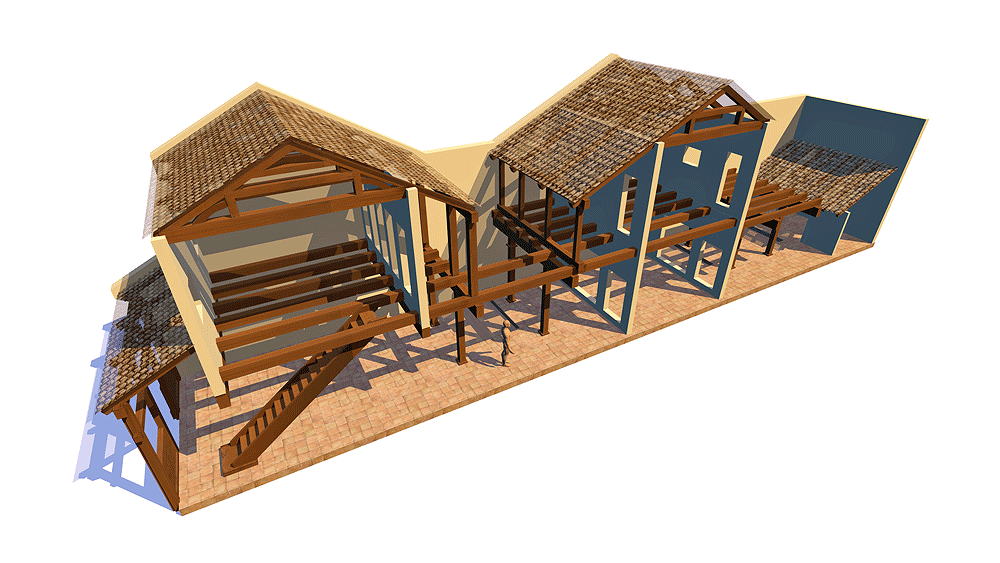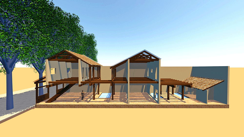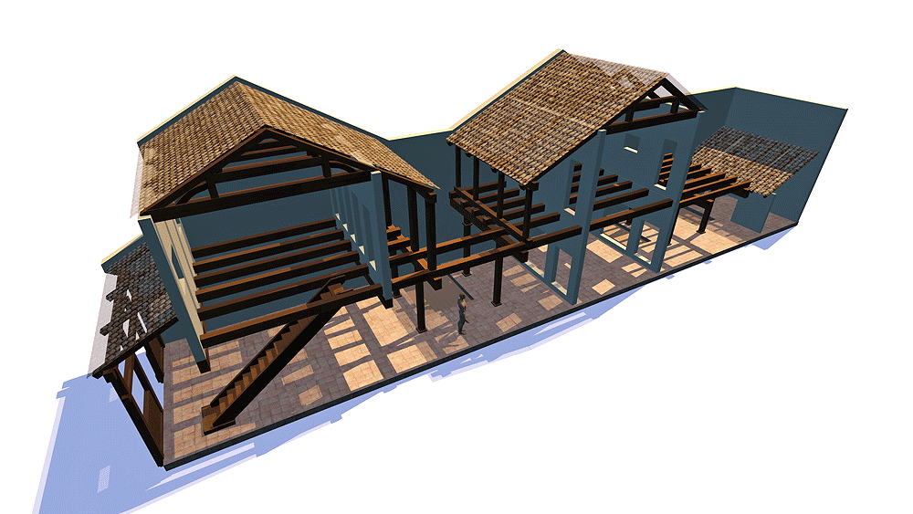 A Classic example of the "Tube House" built in the late 19th century C.E., is this house at 87 Ma May Street in Hanoi, Vietnam. It is a row house along the street, like many others, and these can be two stories high, 70 meters. deep and as narrow as 2m. wide. This house type was developed as an attempt to minimize taxes, which was based on width of street facing facade. Multiple interior courtyards along the length of each house brings light and natural ventilation into the otherwise dark interior. This example is comparatively wide from the norm. Elevation is c. 17 meters (56 feet) above sea level. Materials: timber frame and ceramic tile roof. |