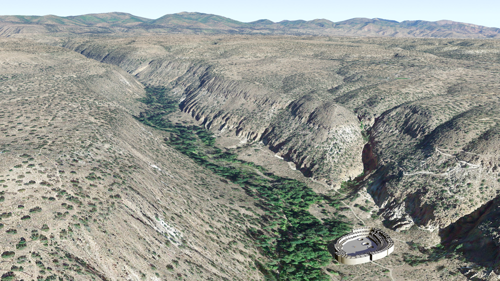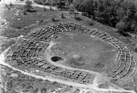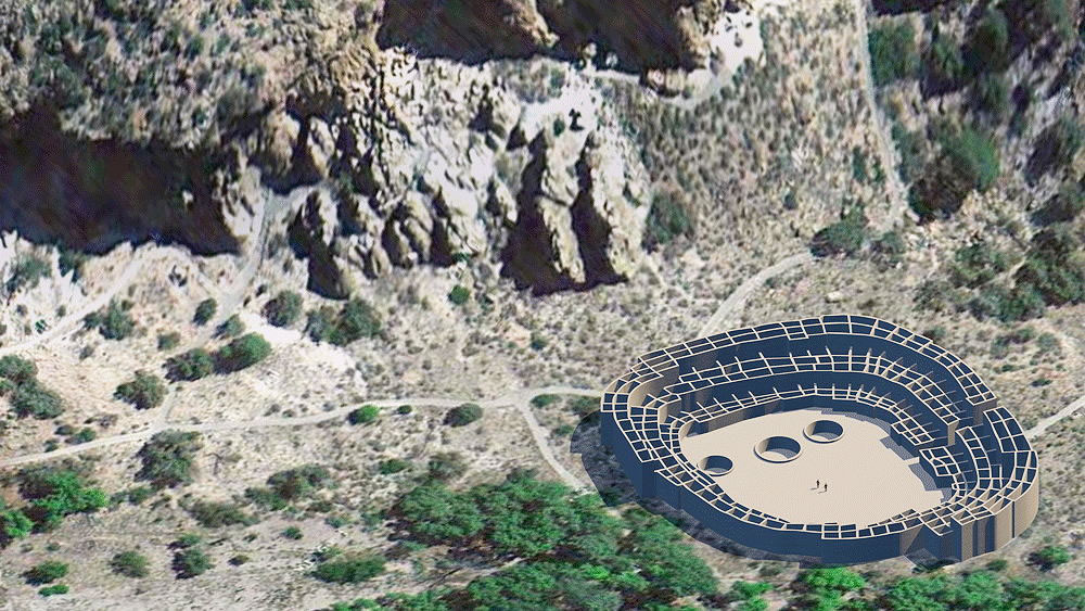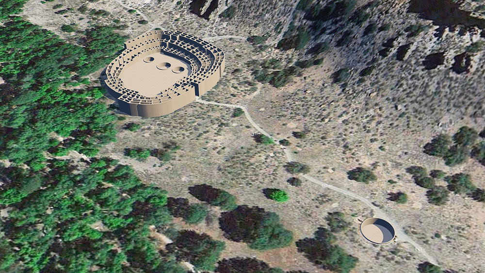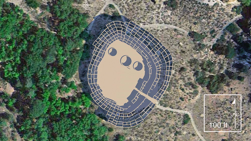 Photomontage of Tyuonyi Pueblo CG model upon aerial photo of actual site in Bandelier National Monument, in the Jemez Mountains of New Mexico. . |