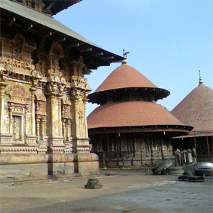 Dated at c.700 C.E. (possibly much earlier), one of the oldest Hindu temples in Southern India with Sanctum sanctorums dedicated to diety Shiva as Vadakkunnathan, Shankaranarayana and Rama. Located in Thrissur, Kerala state, India. The northern side of the main sanctum is a circular structure with central Shiva facing west and behind him is Parvati facing east; the two-storied rectangular shine to the god Rama faces west and is located in the south; between these two sanctums stands the third one, circular and double storied in shape, dedicated to Shankaranarayana, the combined form of Shiva and Vishnu, facing west. In front of each of these three shrines stand halls (mukhamandapams). The central sanctum is surrounded by a massive stone wall enclosing an area of 9 acres (36,000 sq.m.), and includes three massive entry gates in the four cardinal directions. Only Hindus are allowed to enter.