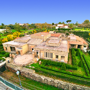 The Villa of the Mysteries(Villa dei Misteri) is a retored suburban ancient Roman villa, a large aristocratic farm house, on the outskirts of Pompeii, on the Mediterranean coast of southern Italy. It contains initiation of a bride into a the Greco-Roman mystery Cult of Dionysus. The City of Pompeii was buried in the eruption of Mount Vesuvius in 79 CE. From 1909 excavations have revealed this exquisite house and its surviving interior frescoes. The Villa is included as part of the Unesco World Heritage Site at Pompeii, and is one of Italy's major tourist attractions. The plan for the Villa contains three or four courtyard-impluviums, which allows daylight into the center of the house, while at the same time helping to control the coolness of shade. The impluviim is an element of several ancient culture, including Senegal, Western Africa (https://www.dennisrhollowayarchitect.com/JolaImpluvium.html). The roof form inverts at a ridge, which slopes to the outside and the inside impluvium of the house. The opening of the inside sloping roof, the compluvium, results in rainwater being collected for drinking in the central low-walled cistern. Employing the principle of evaporative or "swamp" cooling, water in the central cistern evaporates, and in the process transfers heat from the house air to evaporate the water, giving in return cool moisture-laden air inside the house. The roof shades the thick walls from solar heat gain, increasing their heat absorption and cooling effect on the interior house air. Entrance to the ring of rooms is from the central court, thereby trapping and conserving the coolness—a sophisticated example of sustainable architectural design principles. Compluvial / Impluvial architecture is also used by the Igbo, Yoruba, and Edo cultures of southern Nigeria, and was used as well by the ancient Greeks and Romans. Elevation is 38 meters (124 feet) above sea level. Coordinates: 40°45'13.27"N 14°28'39.12"E Materials of construction: