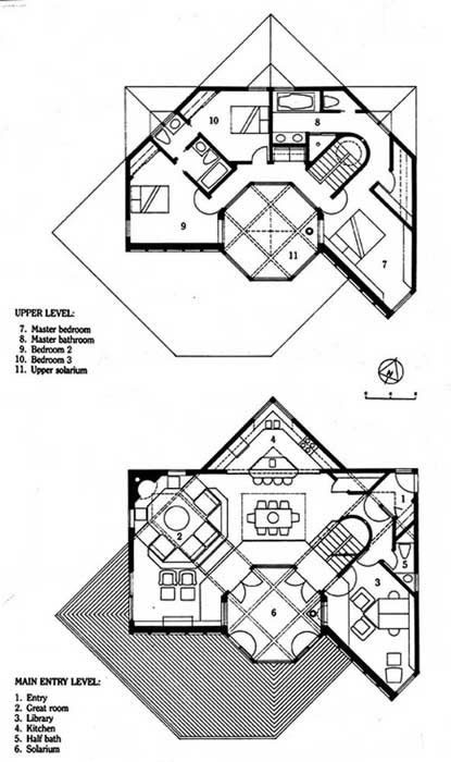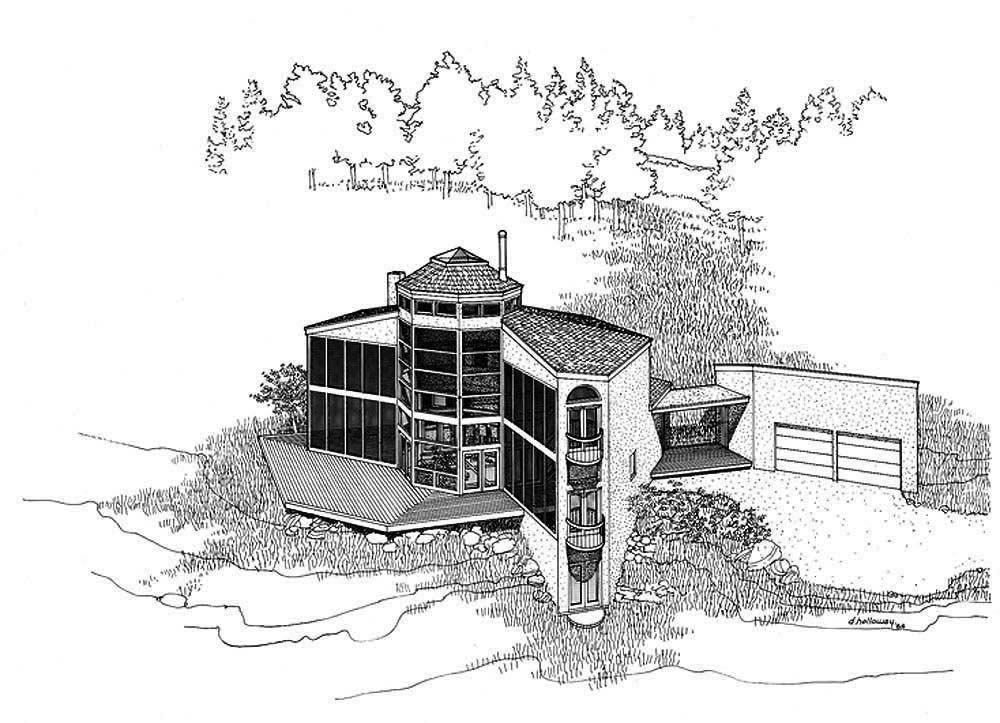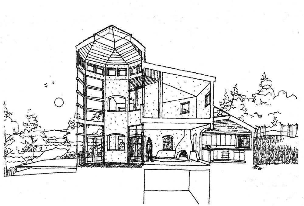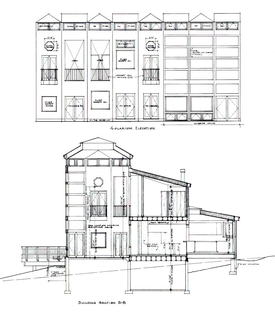 Project for a passive solar residence incorporating Trombe walls and a direct gain passive solar tower.