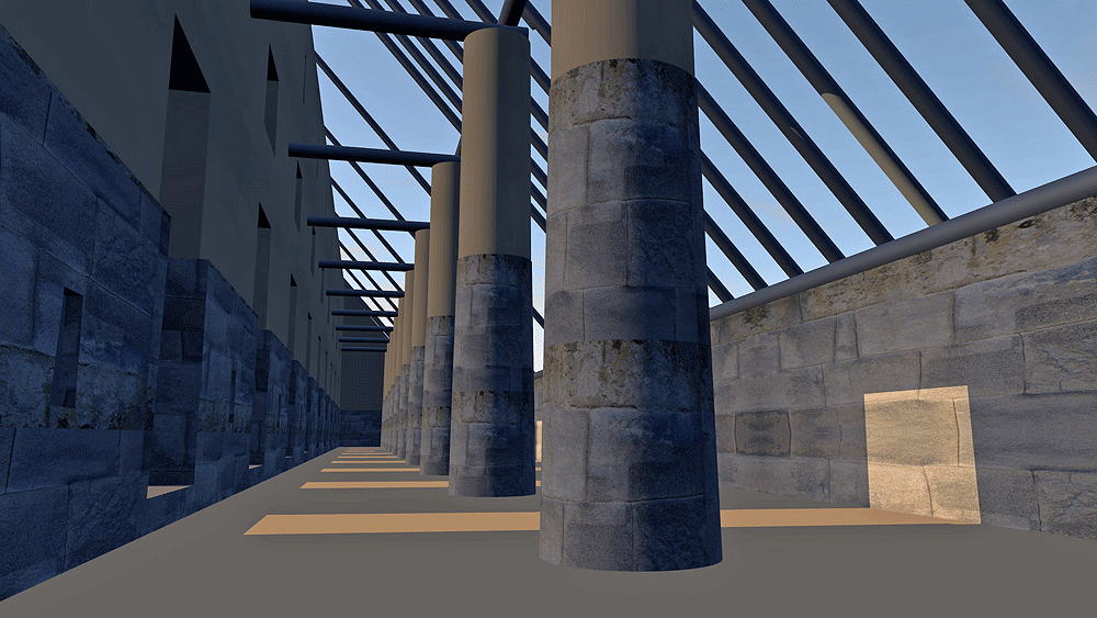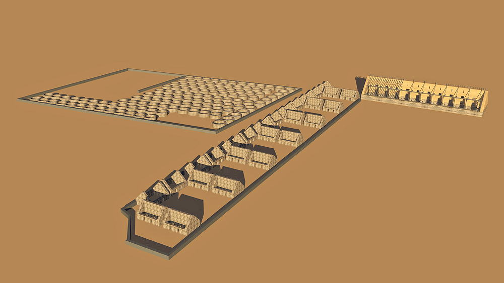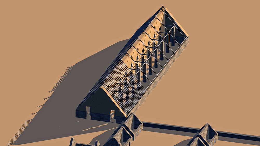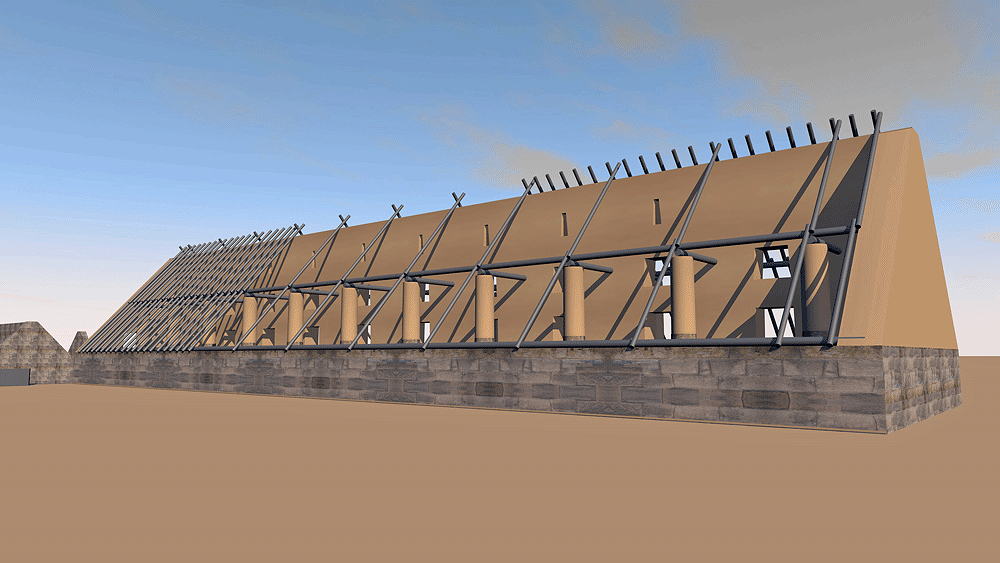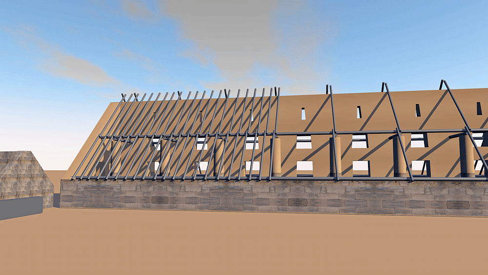 Materials: stone and adobe walls and columns, wood roof beams and purlins, thatch roof.