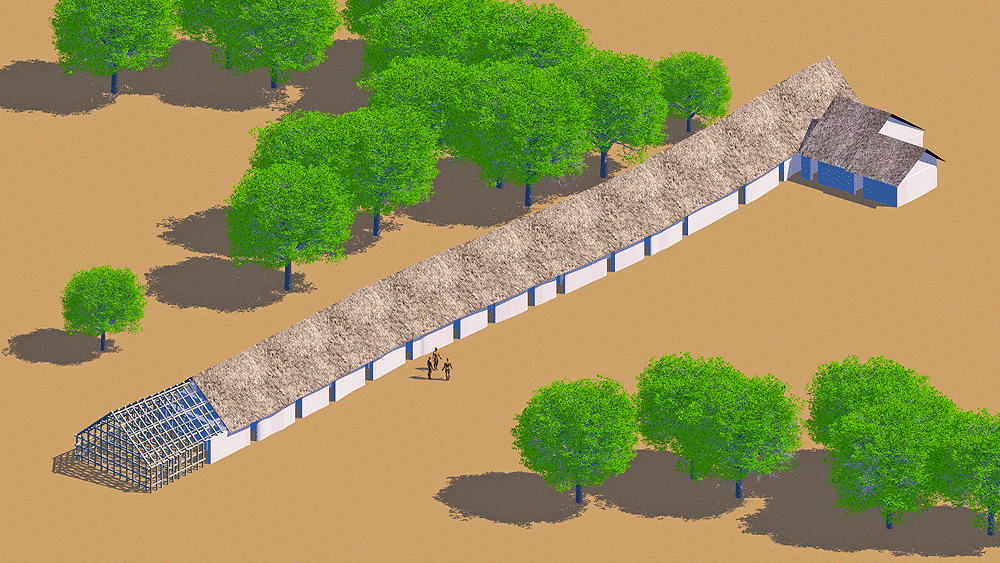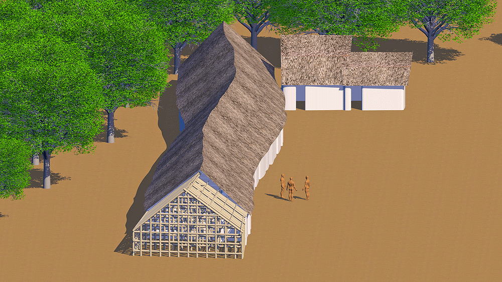 Yangshuo culture is a Neolithic culture located in northern China along a stretch of the Yangtze (Yellow) River. It flourished between c. 5000 BCE to 3000 BCE primarily in the Central Plains provinces of Henan, Shaanxi and Shanxi, regarded as the Chinese cradle of civilization. In the early phase of the late Neolithic, agricultural settlements appeared with increasing population, area, and hierarchical organization. One example of these settlements is Xiawanggang in the middle Han Valley. It is 1000–2000 sq. m in size, and has two rows of houses or longhouses. One house row at Xiawanggang has been excavated, and measured measured 79 meters in length, consisting of 29 rooms joined in a single terrace (shown in this CG model). Assuming an average of 4 persons to a household, each row could have held 100 people, giving a total of 200 for the whole settlement. Each independent unit of the row likely housed a nuclear family and included an entrance hall, and one or two rooms at the back. All entrance doors face southward. Each longhouse was likely a communal residence for a patrilineal family. The main food was millet, though some evidence of rice has been found. Yangshao agriculture, whether small-scale slash-and-burn cultivation or intensive agriculture in permanent fields, is currently a matter of debate. When the soil was exhausted, residents moved to new lands, and constructed new villages. The Yangshao people kept pigs and dogs, and rarely sheep, goats, or cattle. Most of their meat came from hunting and fishing with stone tools. They may also have practiced an early form of silk production and hemp weaving. Yangshao artisans created fine white, red, and black painted pottery with human facial, animal, and geometric designs. The pottery was hand coiled without the use pottery wheels. Excavators found that children were buried in painted pottery jars. Elevation is c.1220 m. (4000 ft.) above sea level. Construction: Foundations and floors were rammed earth, with walls above of lattices of wattle, plastered with layers of mud. The matrix of plastered walls supported roofs composed of thatched millet stalks. Sources of data for CG model: |