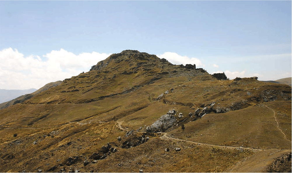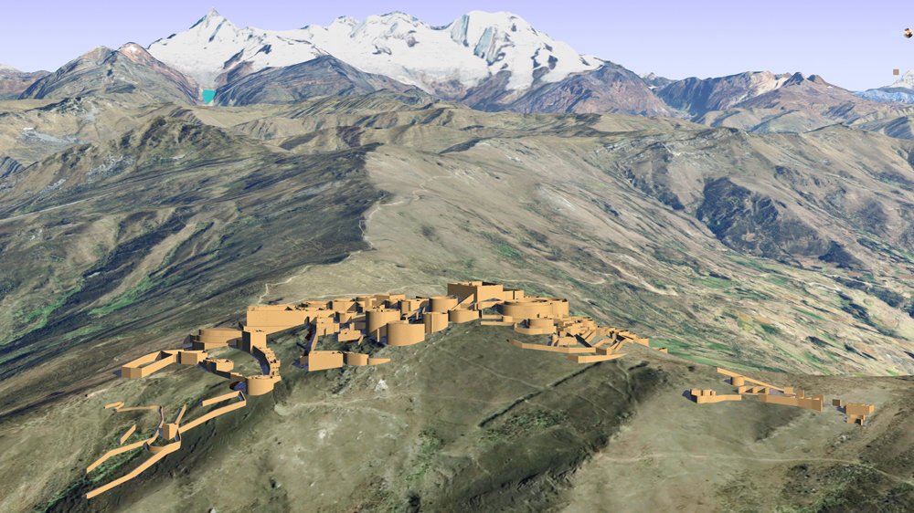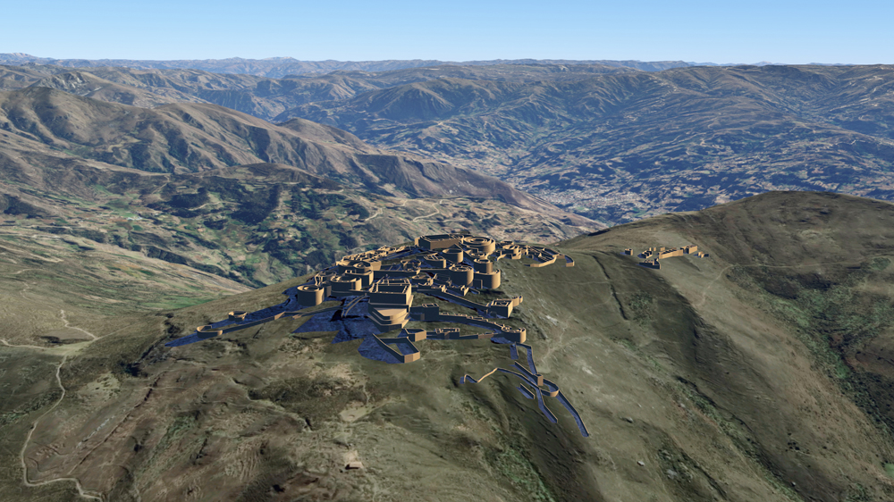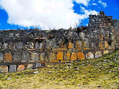 Recuay Culture, 400 C.E. to 800 C.E.. The ancient pre-Inca hilltop center of Yayno, Pomabamba, is located in the Andean north highlands, in Ancash, Peru. This was the center of a network of small farming villages, and was the defensive place for this network, while at the same time keeping the individual villages physically separated. The complex to rectaliear and round structures was ingenious for the way the concentric ring walls were used to support mazes of floor structures. Location coordinates: 8°53'08.7"S 77°27'20.2"W Elevation is c. 4100 meters (13,500 feet) above sea level. Materials: stone walls; wood beams for floor and flat roof structure; mud/clay roof over brush mats.