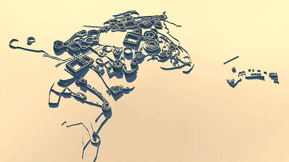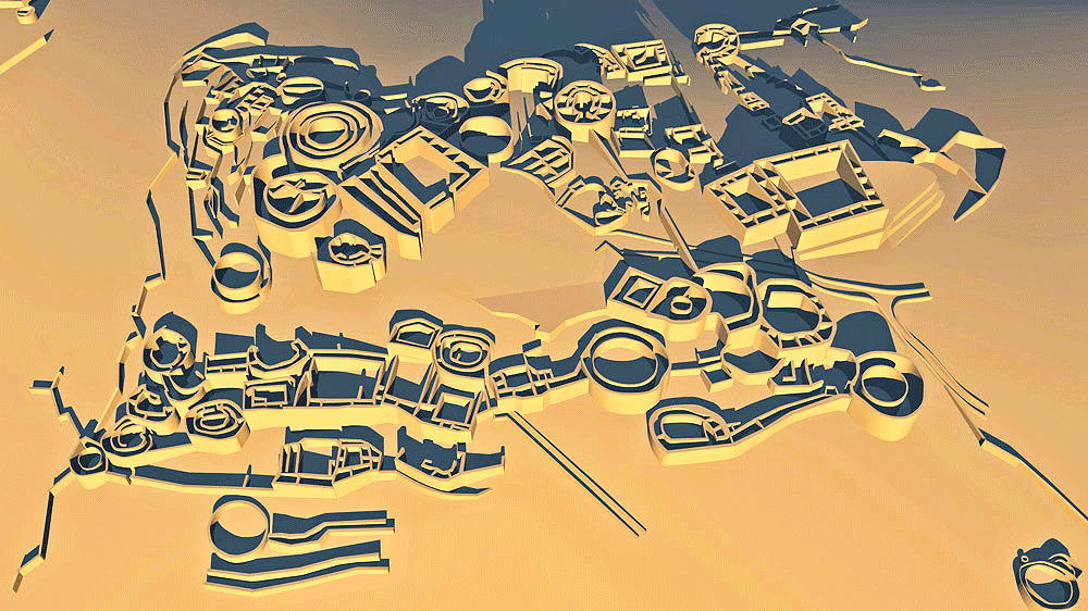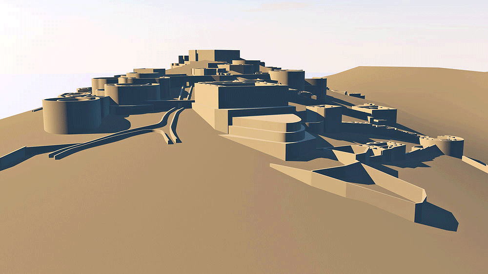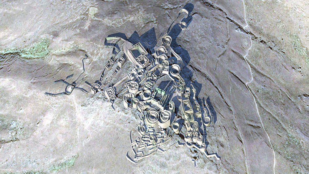 Photomontage of Yayno CG mode upon aerial view of actual site, looking east toward AndesMountains.